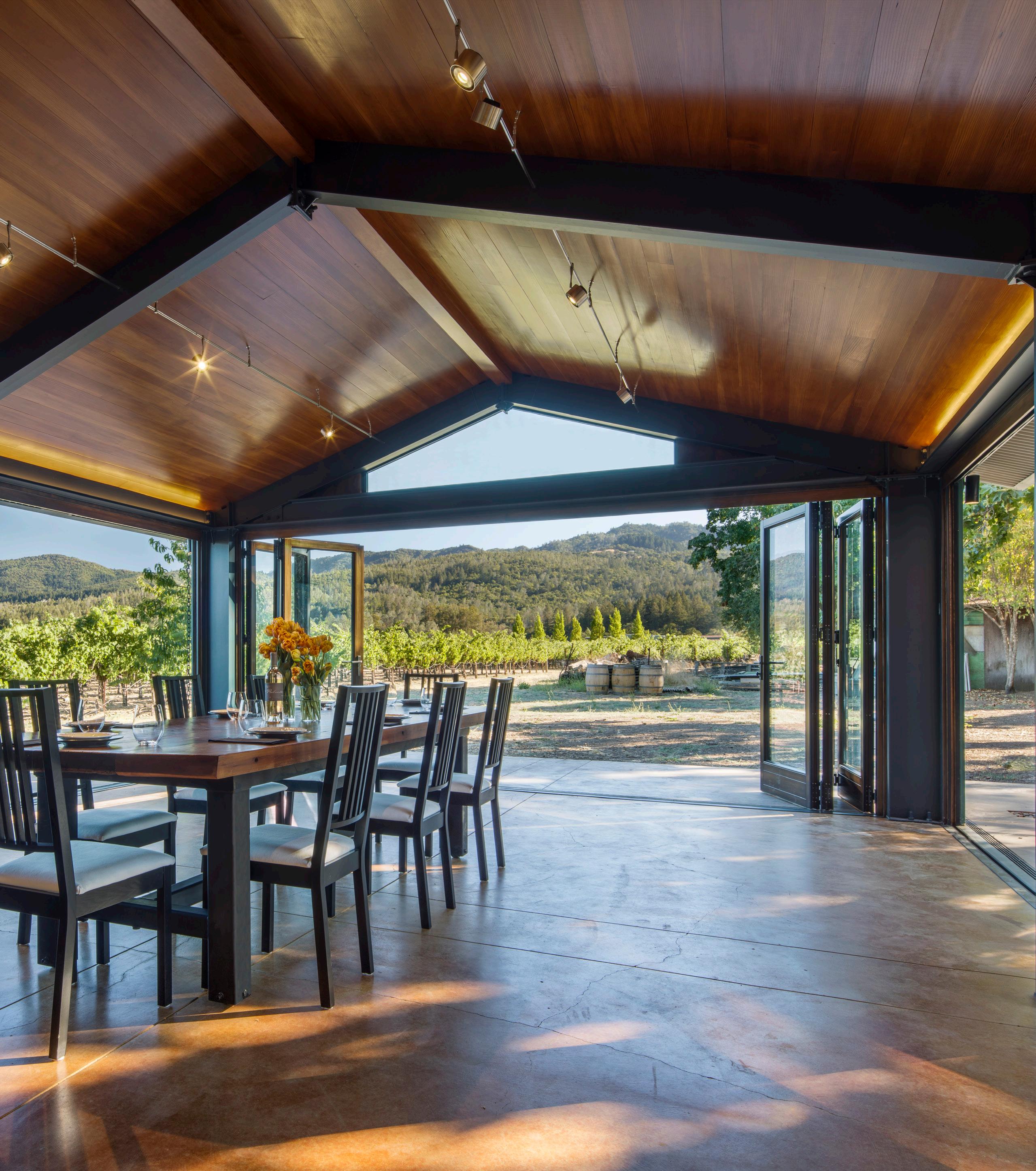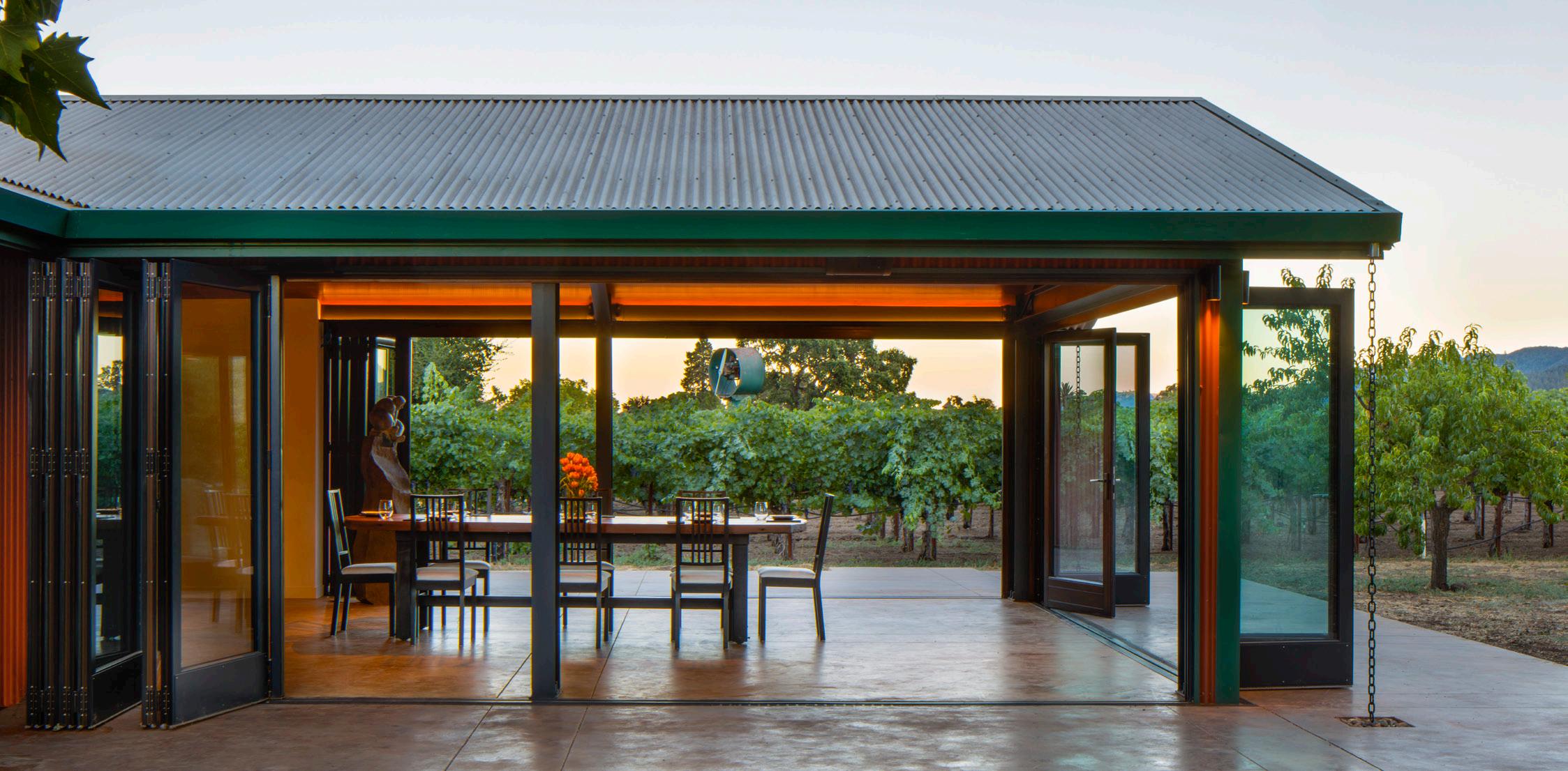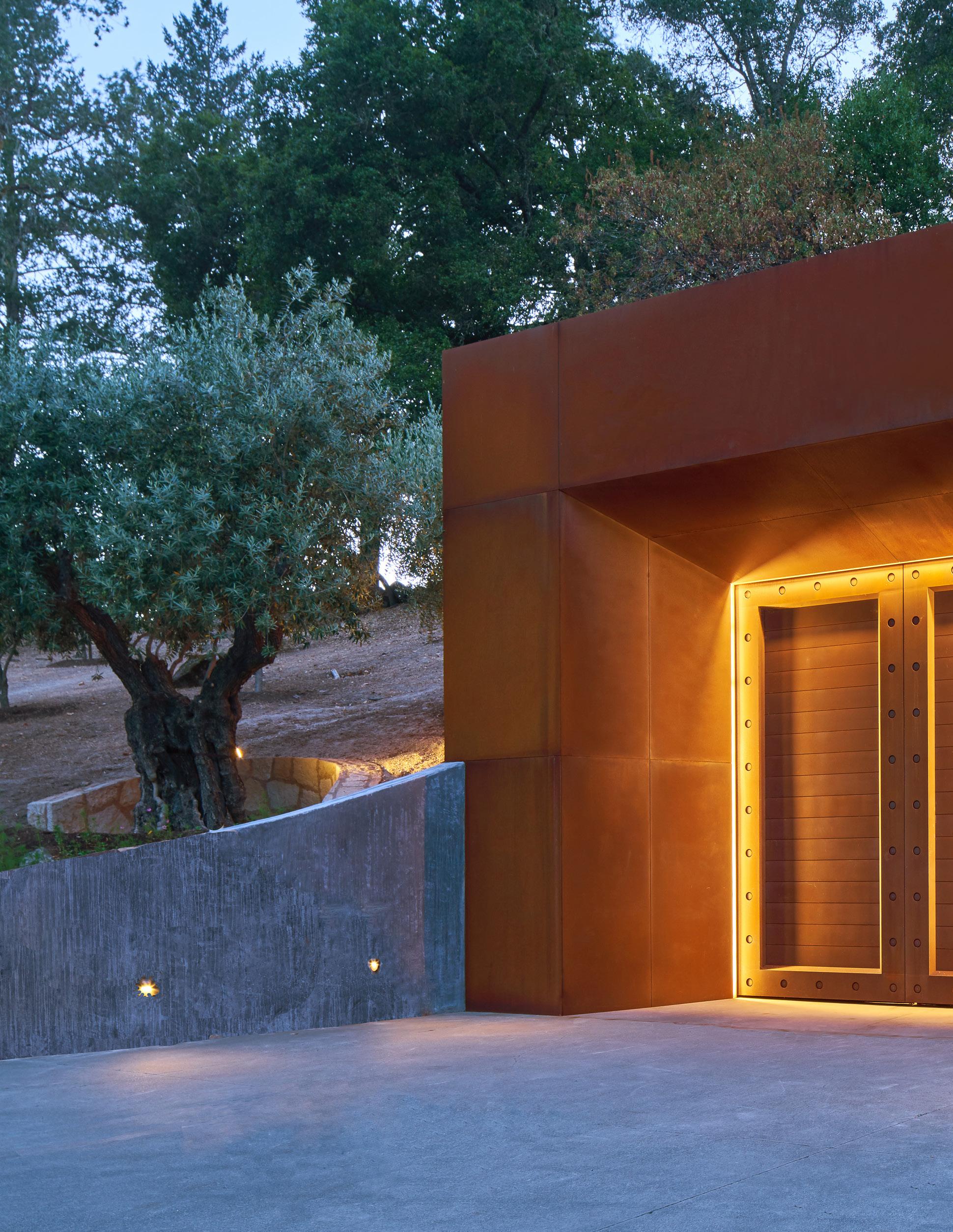 The big move in this wine cave entrance is, in a sense, the design itself; a prominent cube nestled into the hillside highlighting the point at which one enters the cave.