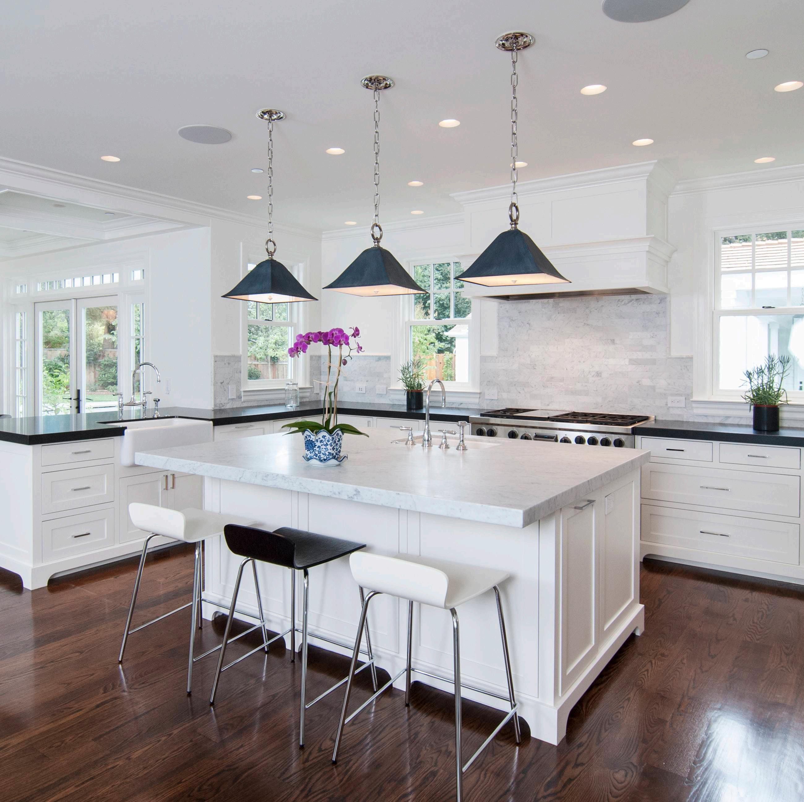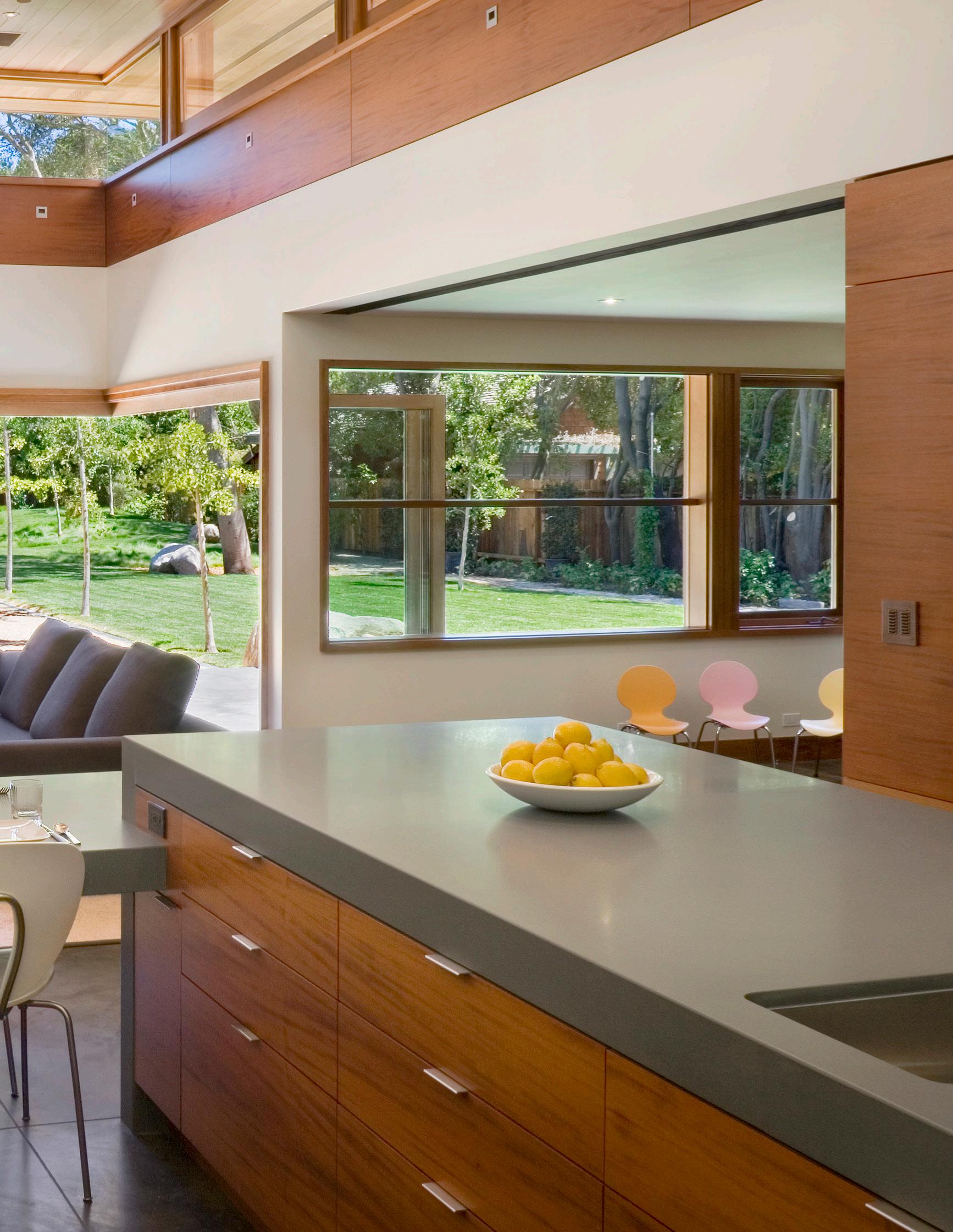The organic lines of the marble island anchor the composition of this kitchen and counter-balance the orthogonal lines of the architecture.