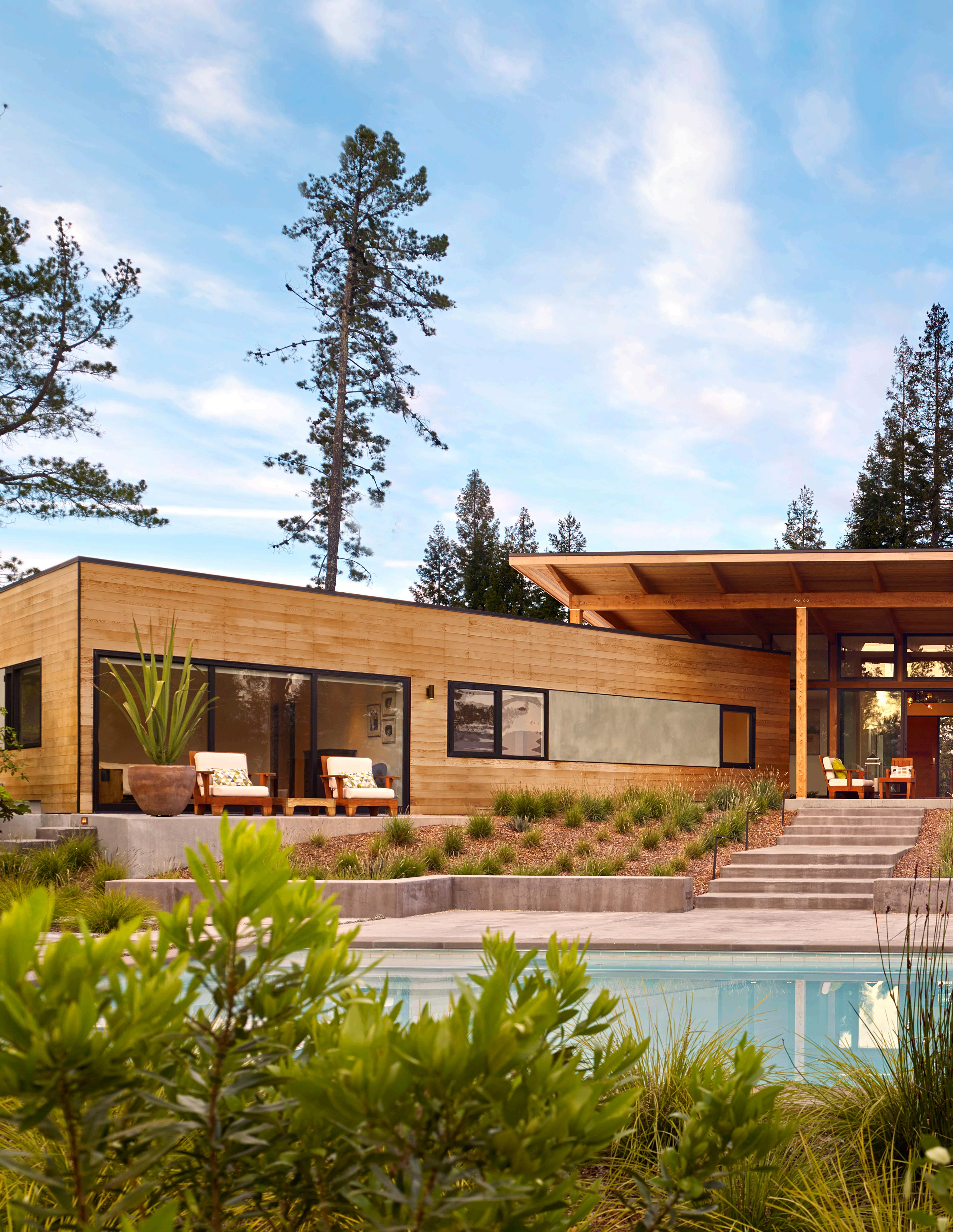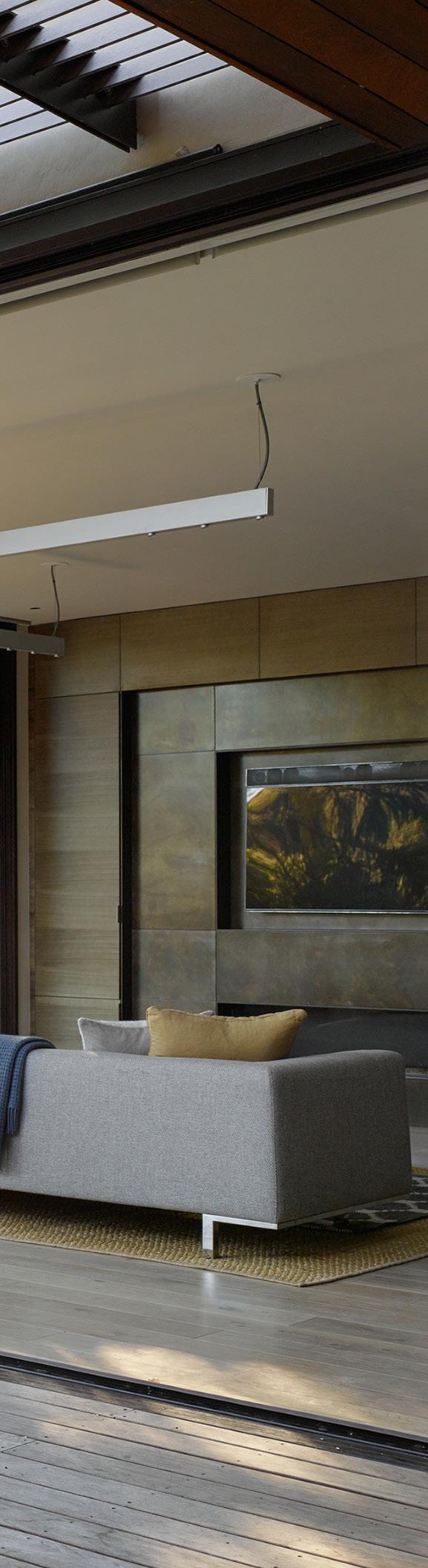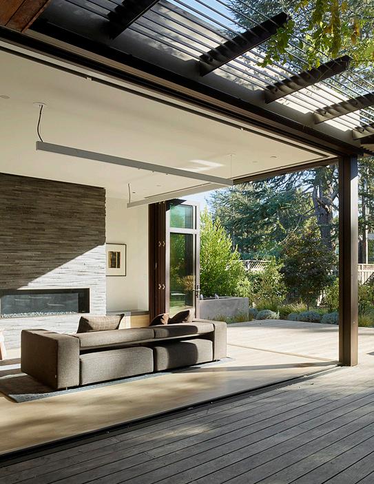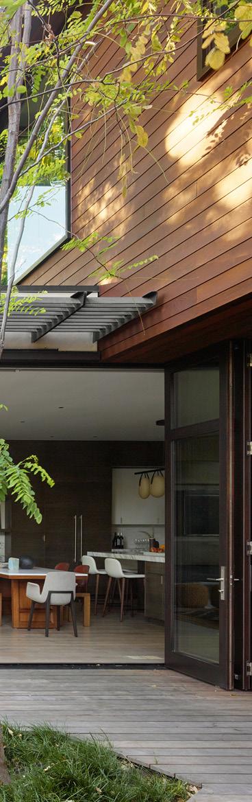 The horizontality of the spaces at the rear of this home are accentuated by the brise soleil above the doors, which serves as a composed counterpoint to the vertical elements.