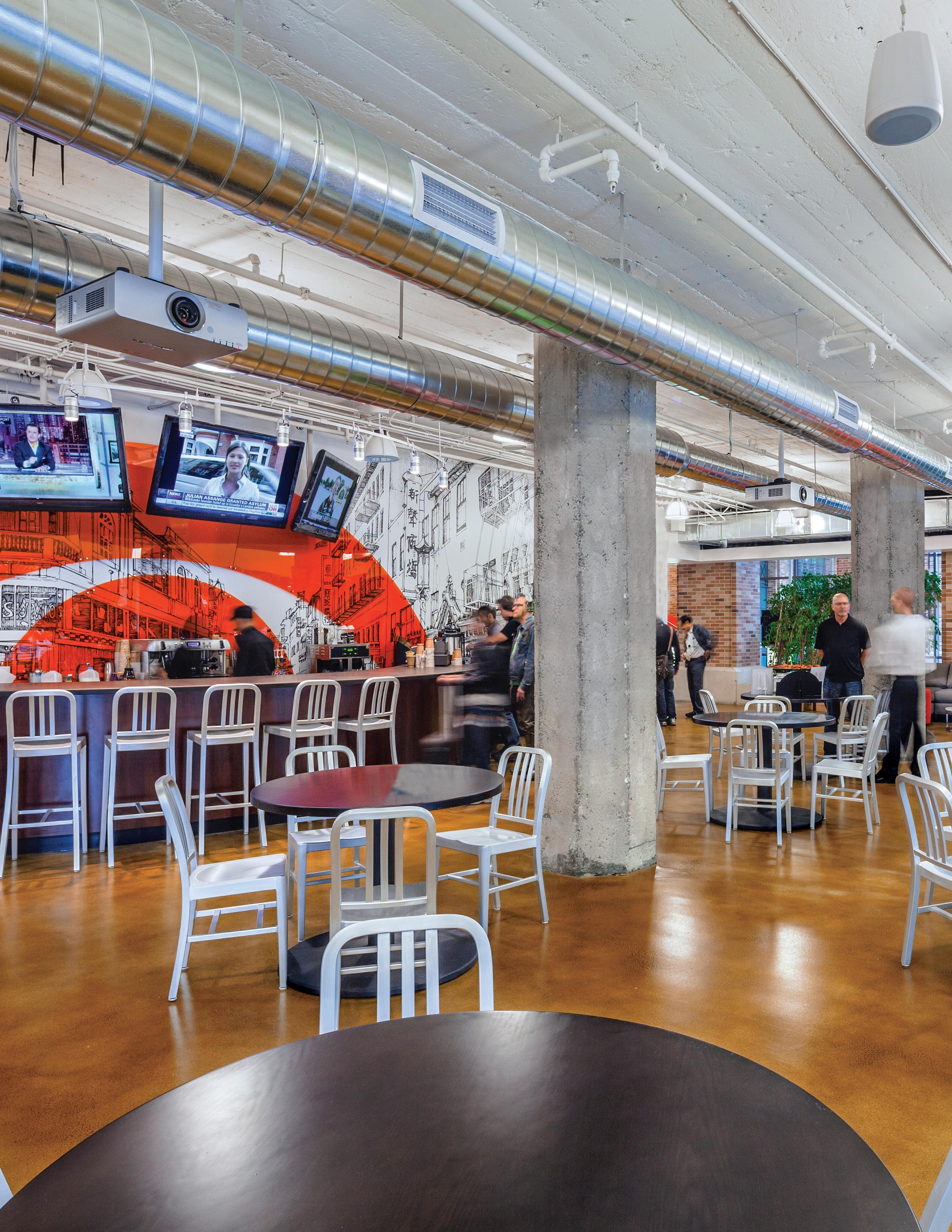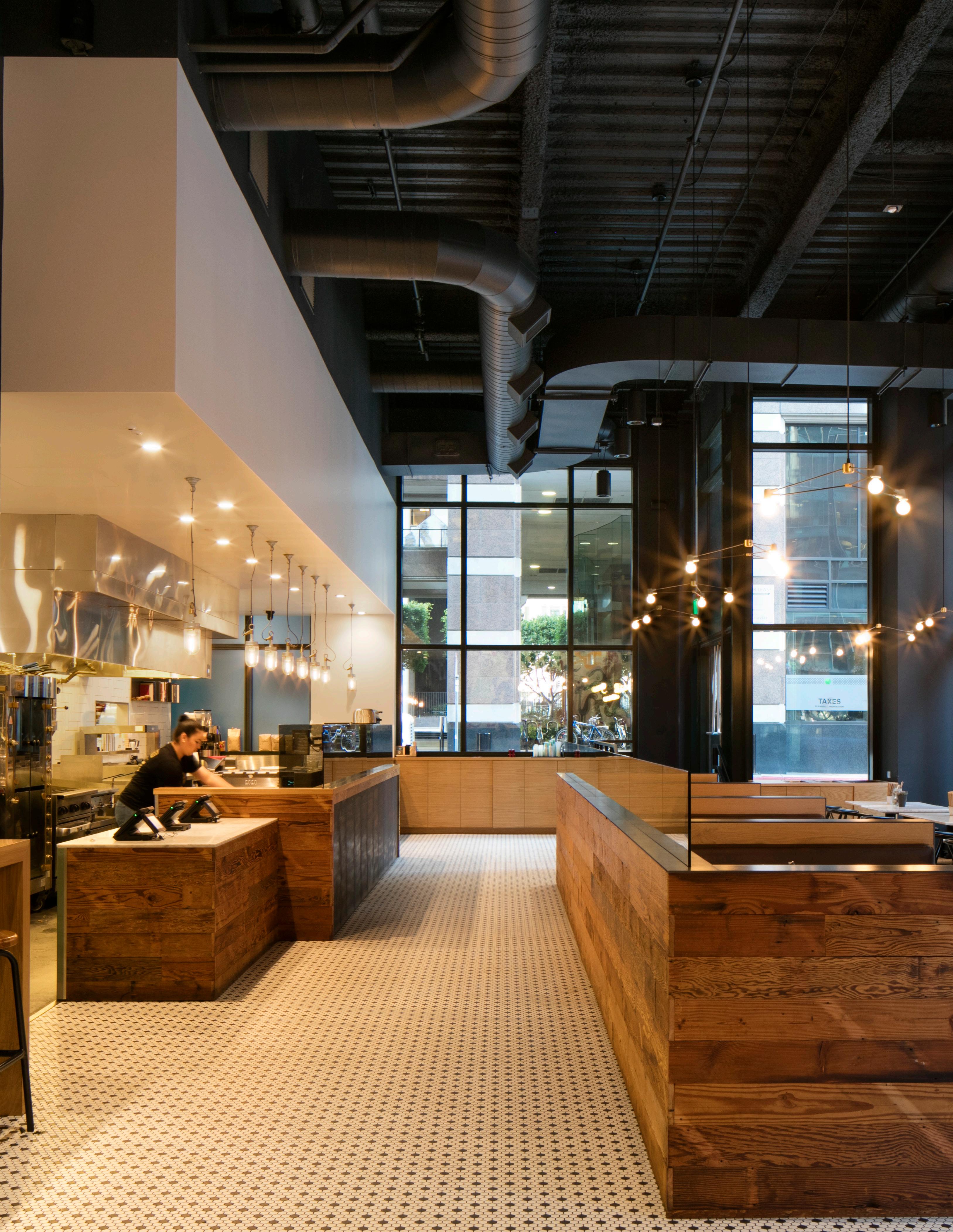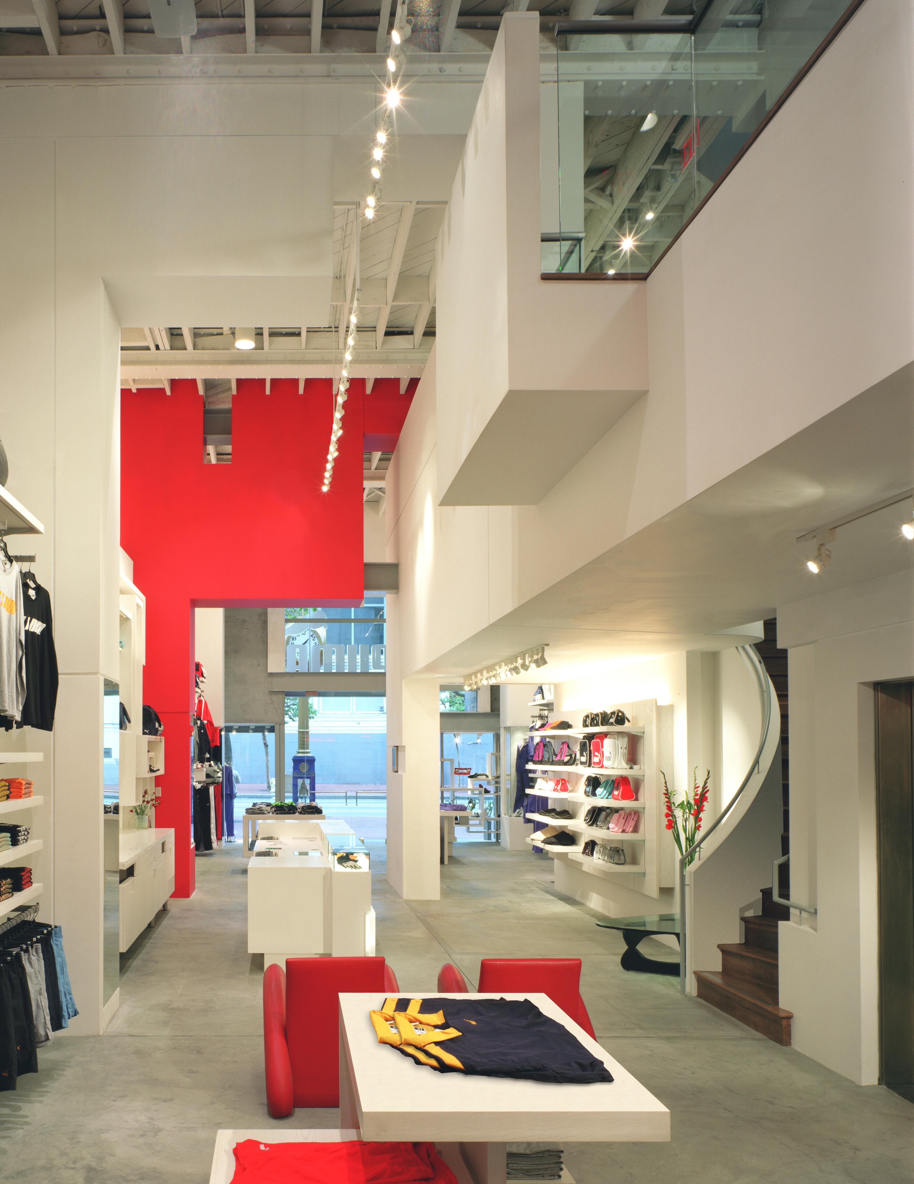 The interplay of shapes and forms begins at the storefront of this building and continues through the space creating interesting compositions from every angle.
