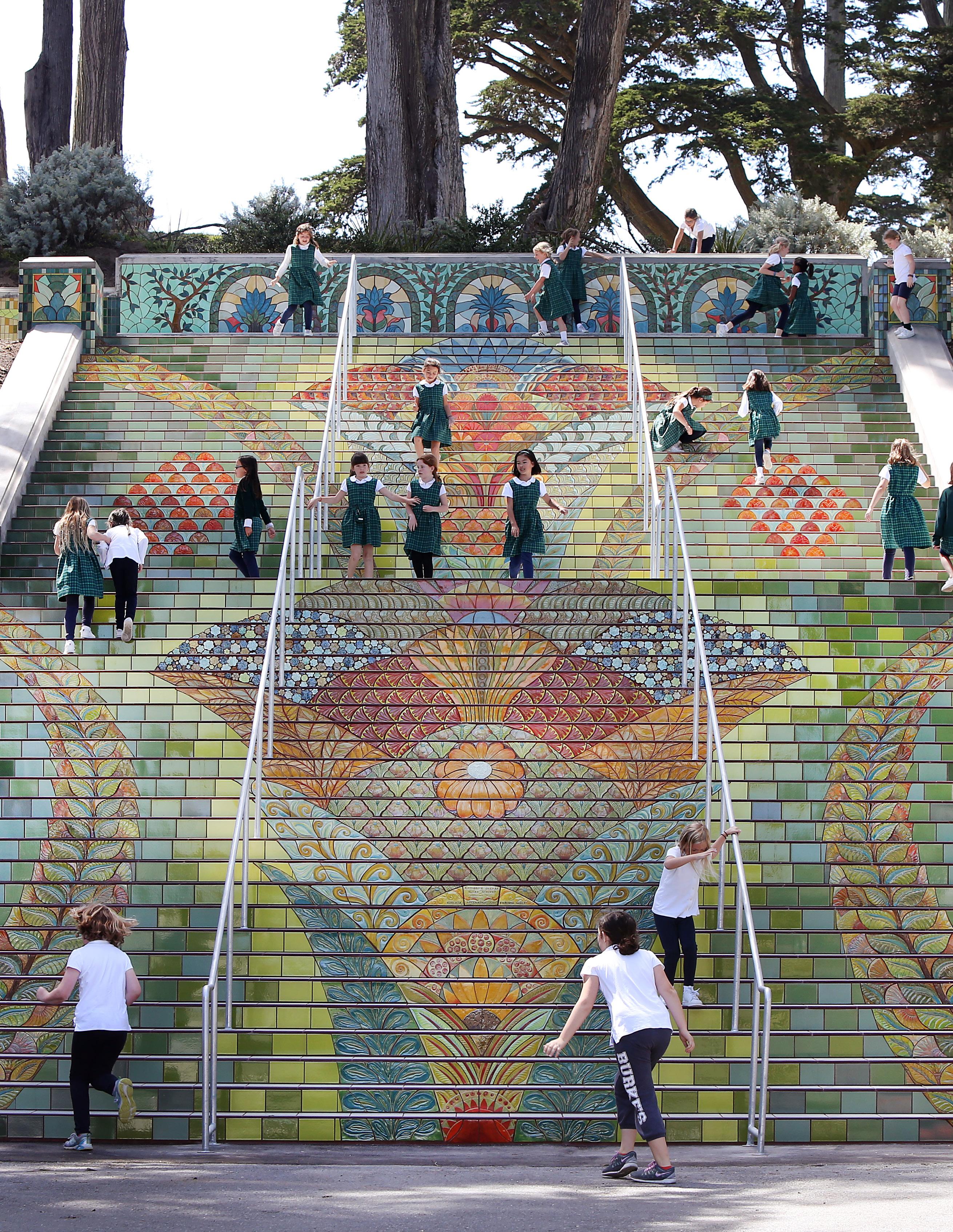 These steps function as both art and architecture. The enjoyment of the piece is enhanced through the constantly changing visual experience while interacting with it.