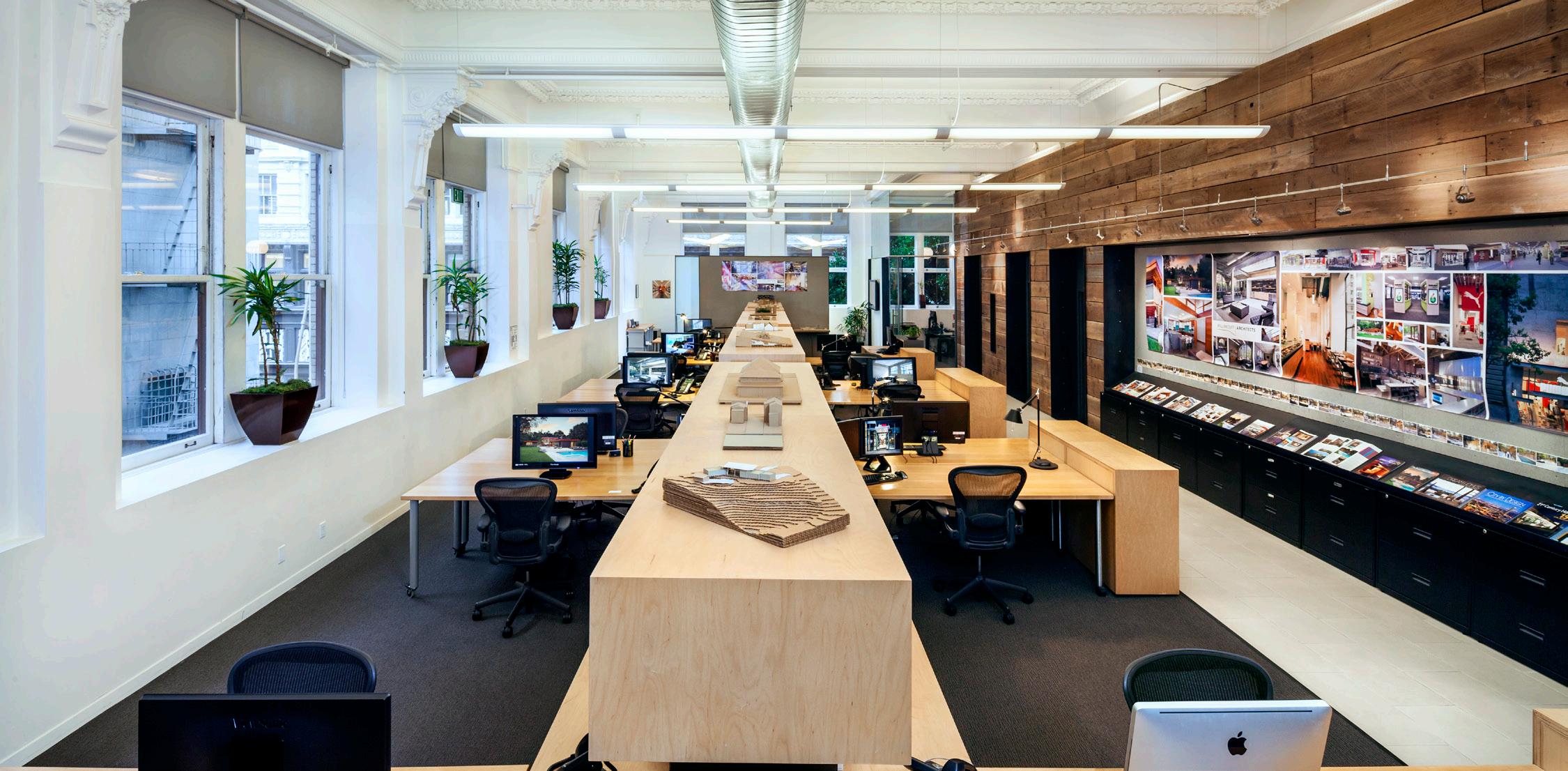 Both of these projects show a dominant big move. The swooping curves of the millwork kiosks and the orthogonal wood spine both affirm a navigation point for each design scheme.