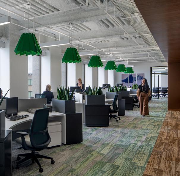 The resulting space supports a modern, hybrid-style work environment which balances places of retreat with communal hubs that promote the exchange of ideas and a sense of