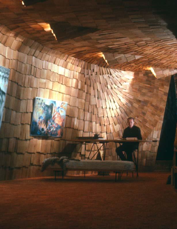 In 1961, Greene designed and built his Prairie House in Norman, Oklahoma. The idiosyncratic and innovative architecture of Greene’s Prairie House caused an international sensation and was published in Life and Look magazines, Progressive Architecture (St. Martin’s Press), and numerous journals throughout Europe and Japan. Greene’s residential work, following Goff’s architectural philosophy, is an expression of the client’s existential qualities (personality and physiognomy), as well as conditions related to site, region, and the nature of materials. In addition to architectural work, Greene makes collage paintings as an exploration of existential philosophy and the power of images on the human psyche.