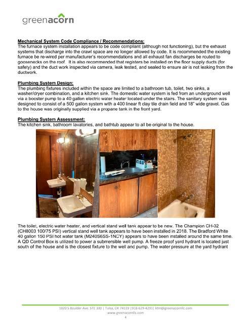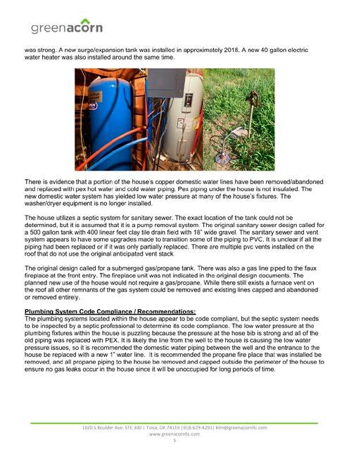Work includes replacing sinks, toilets, and faucets, capping lines, relocating roof vents, testing/upgrading piping, installing a new water line, and inspecting septic systems.