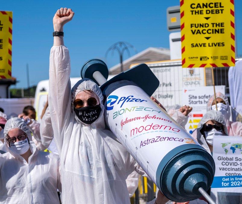 by South Africa and India more than a year ago, and now backed by over 100 governments. The EU put forward an alternative proposal in July in an effort to further delay the negotiations, and once again no agreement was reached. Amid all this lack of action, rich countries have announced plans for booster shots or third doses while not prioritising solutions that can bridge the gap between the vaccine hoarders and the rest of the world. By late August 4.8 billion vaccine doses had been delivered globally, with 75% going to only 10 countries while vaccine coverage in Africa was at less than 2%. As Ninety-Nine goes to press, © Jess Hurd/Global Justice Now the modest WHO goal of vaccinating 10% of the population of each nation by the end of September is unlikely to be met, even as close to 10,000 people a day still dying from Covid-19 across the world.