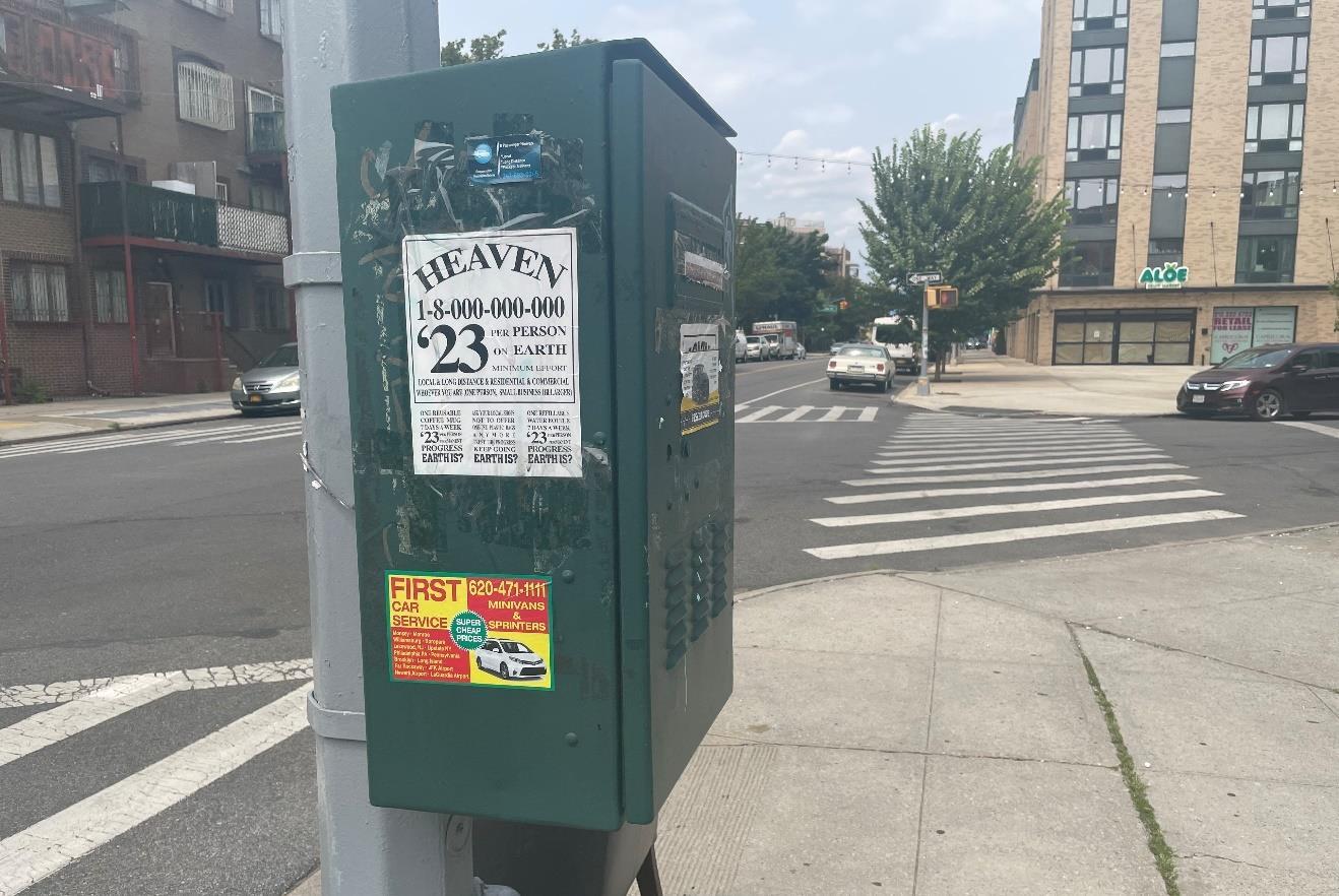 The location of the last atypical street ad is on a light pole at the corner of Union Avenue & Wallabout Street.
