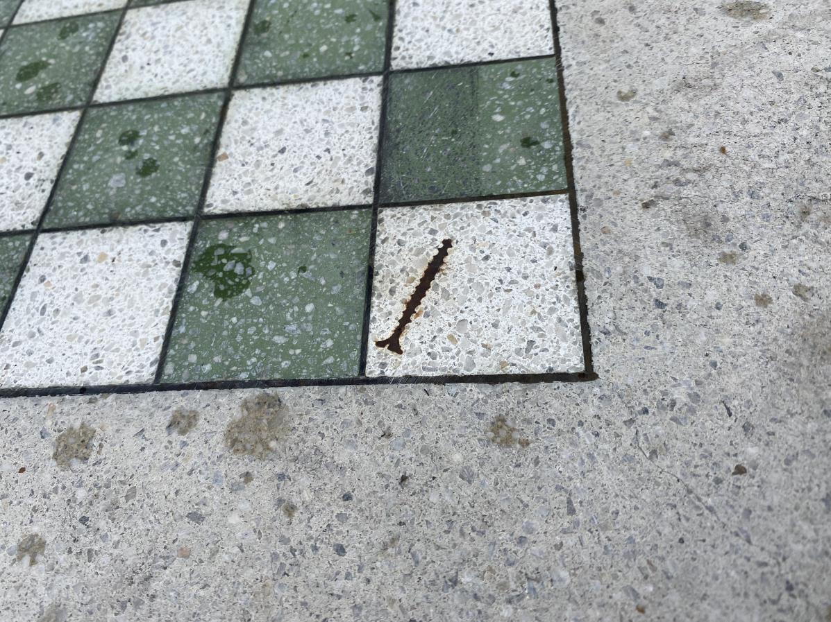 This is the sign that you’ve nailed it, meaning that you found the right table which has a nail embedded on its surface! (Itisthefourthtableontheleftsideof the 1st Clue 3 photo;startcountingfromtheclosestoneseeninthepicture.)