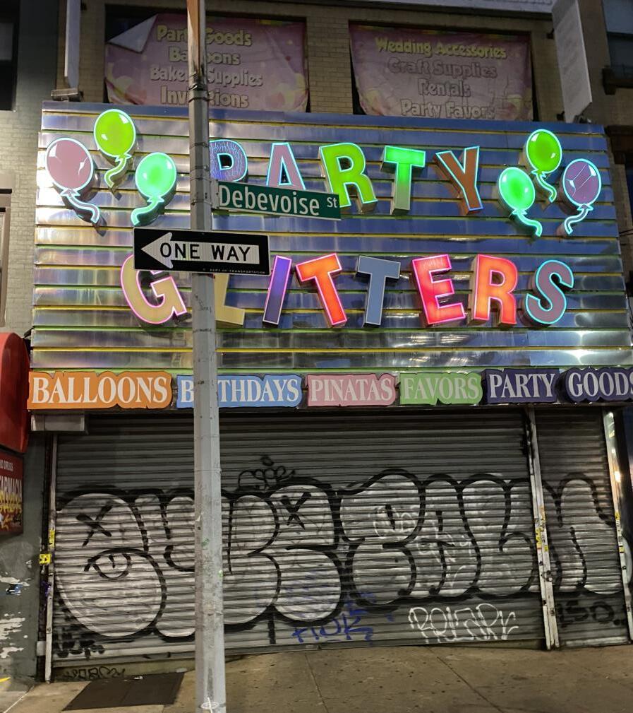 Hint: The name of the party store must rhyme with “Litters” (as in “he or she litters”).