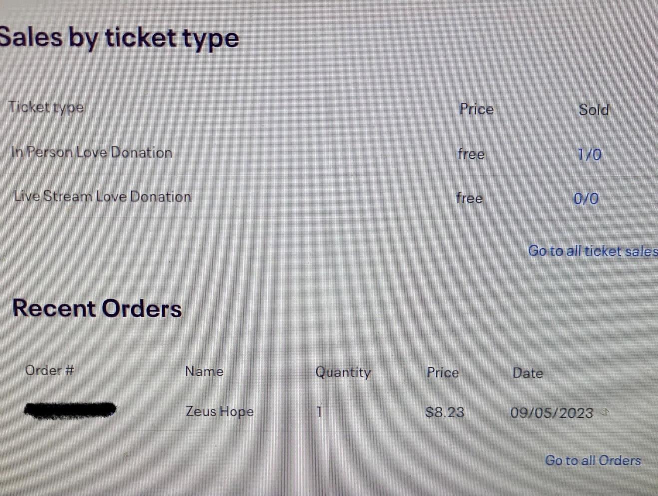 Followingis the first ticket boughtonline(donationbasis).Someonewellintended chosethealias Zeus Hope &paid$ 8,23!Theplayfulnesswasappreciated&wetook itasasignofgoodluck.
