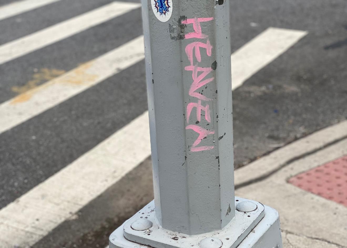 This handwrittenHeavenisona street light poleat theintersectionof Flushing & Throop.ContinuedownThroop&stayonthisverysamesidewalk,butdon’tleave beforereadingthenextclue.