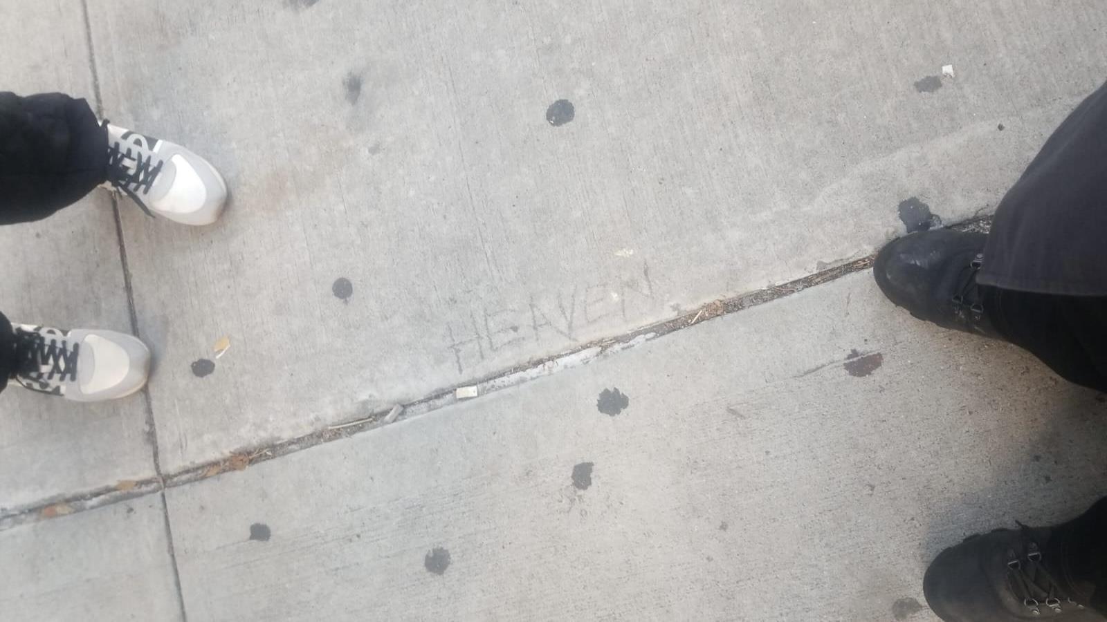 Hint -> visuallyscan all light poles (so you will have to cross in order to do that), however,donotleavetheintersection.Sticktoitandlookfor handwritten Heaven twice.