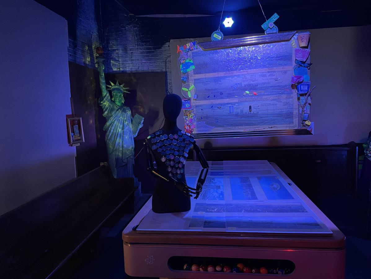 Detailofthecenterpieceseenontopofthepooltable;mixedmediamademainlyout oflitteredobjects;named “The alphabet of … (?)…. as a diagram.”