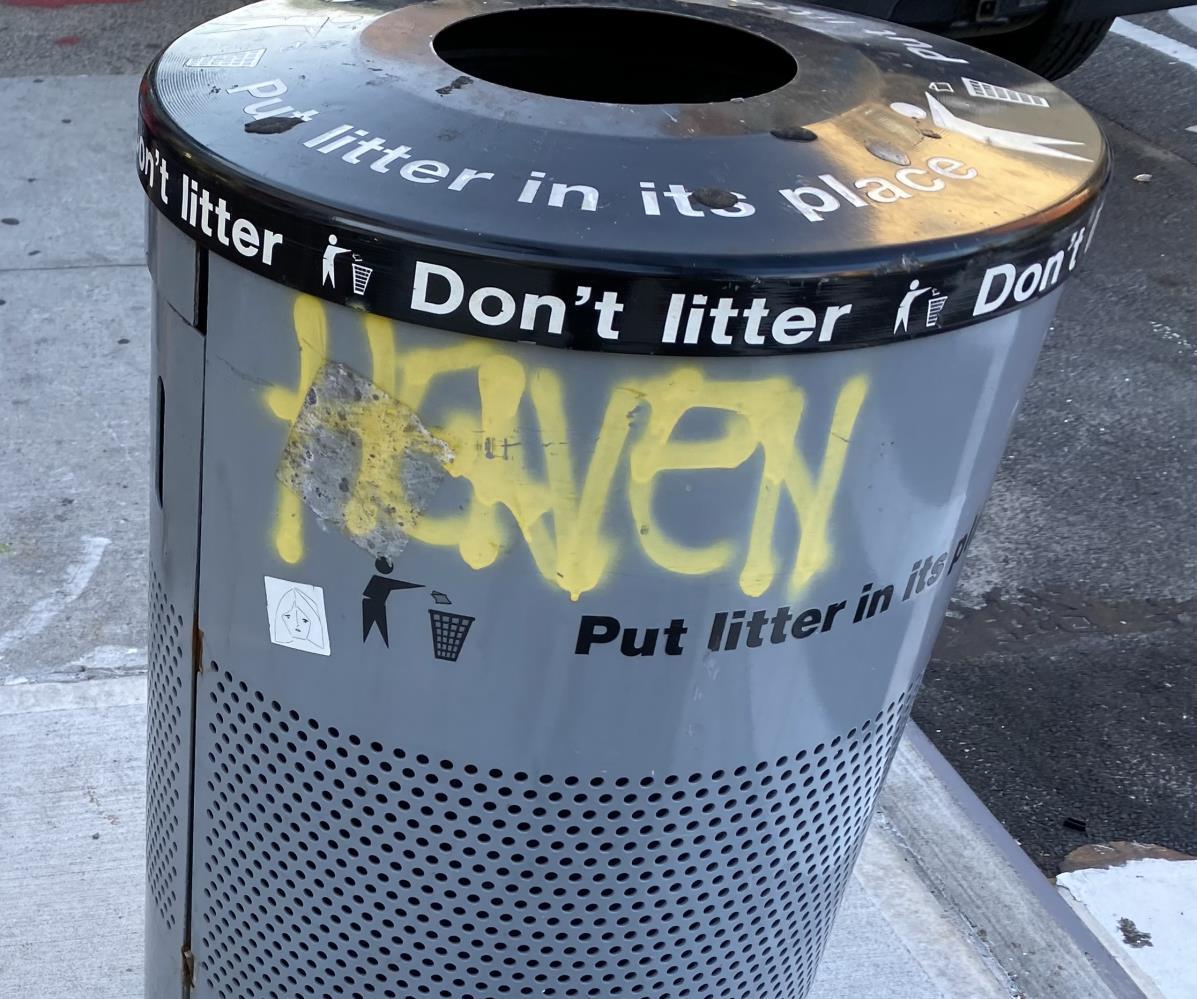 This is Heaven on a trashcan at the corner of Park Avenue & Throop, in front of another corner store.Readthefollowingcluefortherightdirection.
