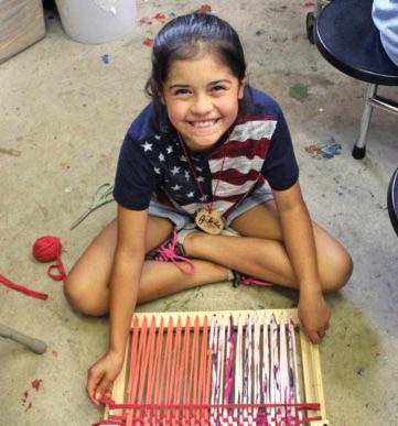 A young camper learns to weave. Marjorie Conkwright, a professional artist serving as a one-year volunteer and AmeriCorps member, has brought her love of Appalachian crafts to Camp AJ.