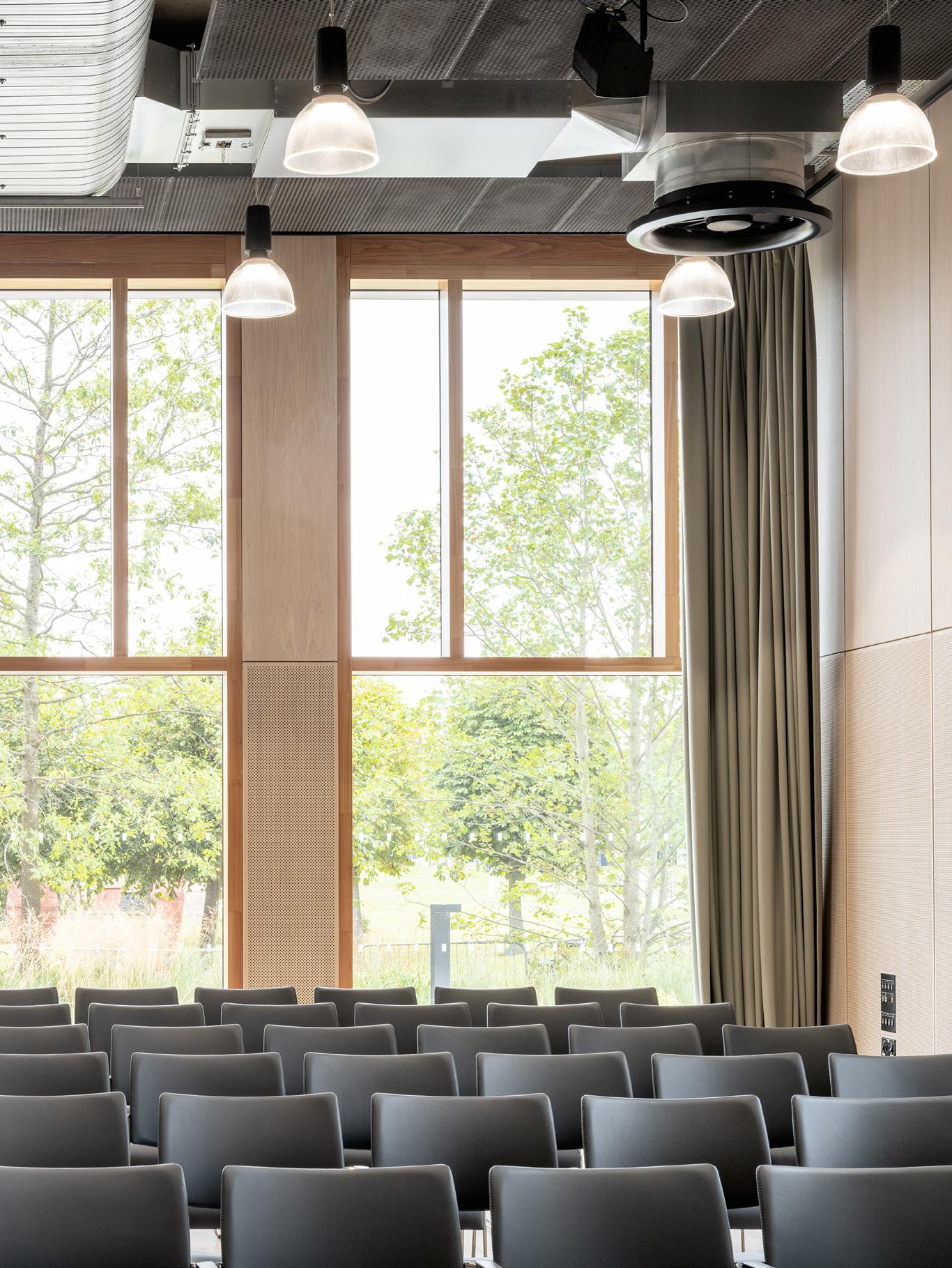 All areas within the office building are comfort cooled and heated using a highefficiency heat recovery variable-volume displacement ventilation system. This comprises two exposed side-by-side-roofmounted full fresh air supply and return air AHU plant, with air ducted to control zone (slaved quarter floor plate) VAV boxes within raised access floor voids.