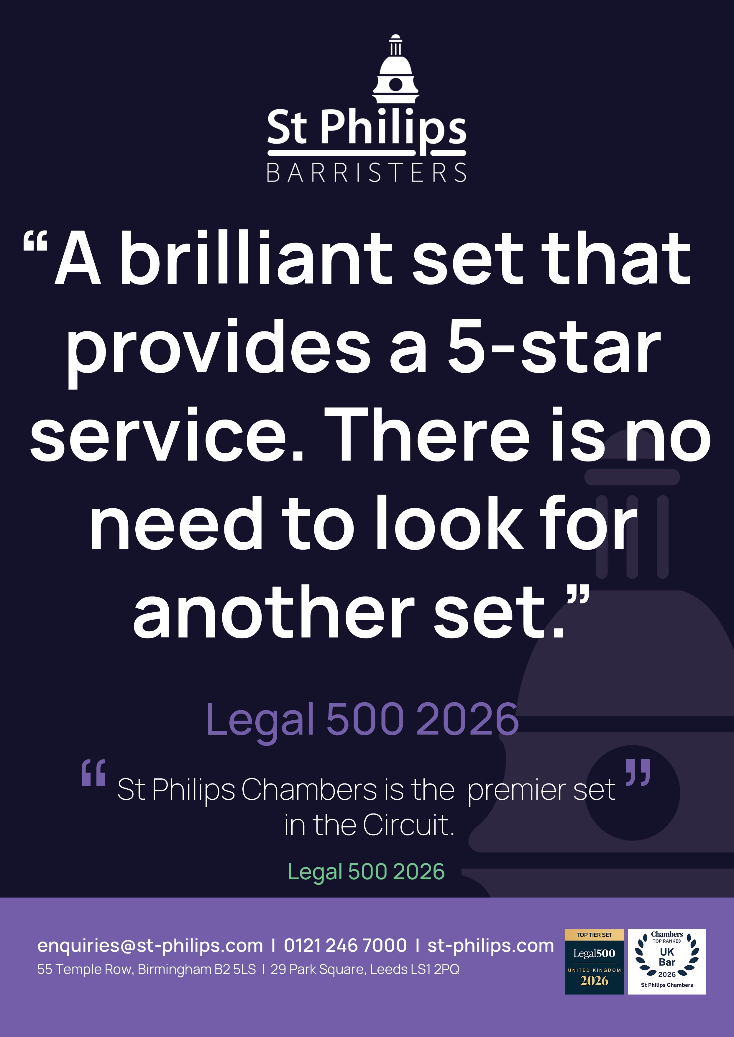 The recently published Legal 500 Bar rankings once again affirmed St Philips’ reputation for excellence, as we retained our position as a Top Tier Set. In 2025, Chambers achieved 103 individual barrister rankings across the Midland and North Eastern Circuits and 11 Practice Groups ranked. These results reflect the calibre of our members, clerking team and support staff. St Philips extends sincere thanks to our clients for their continued trust and invaluable feedback throughout the Legal 500 research process.