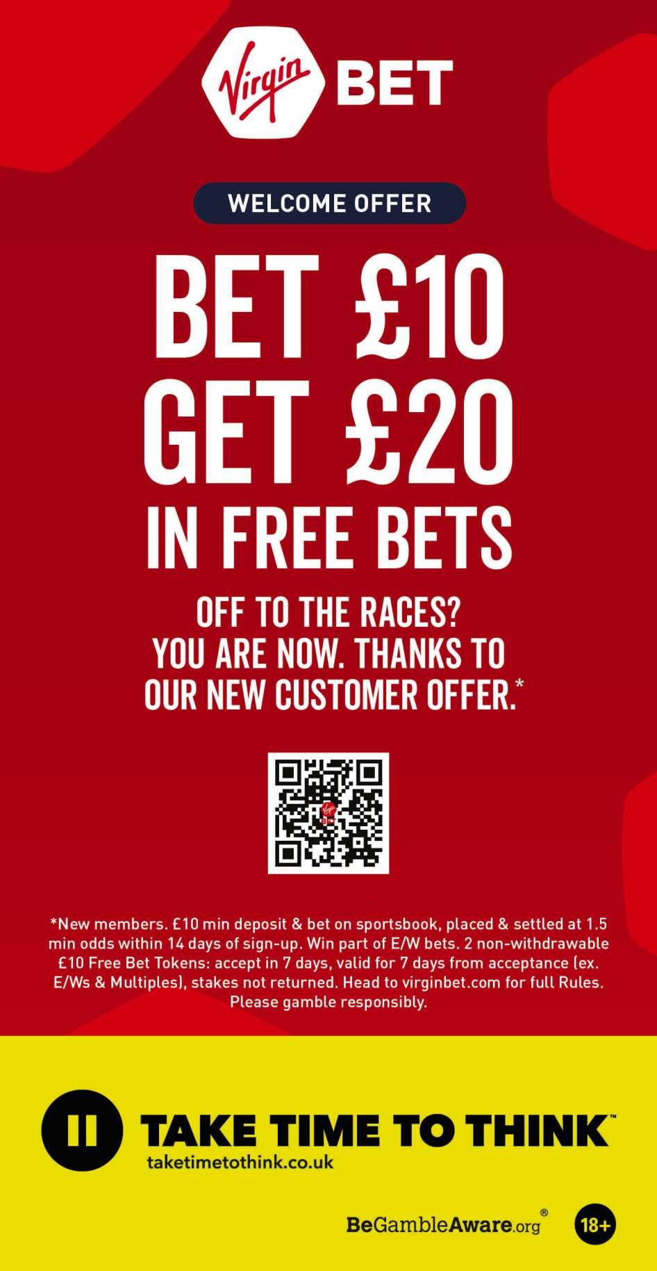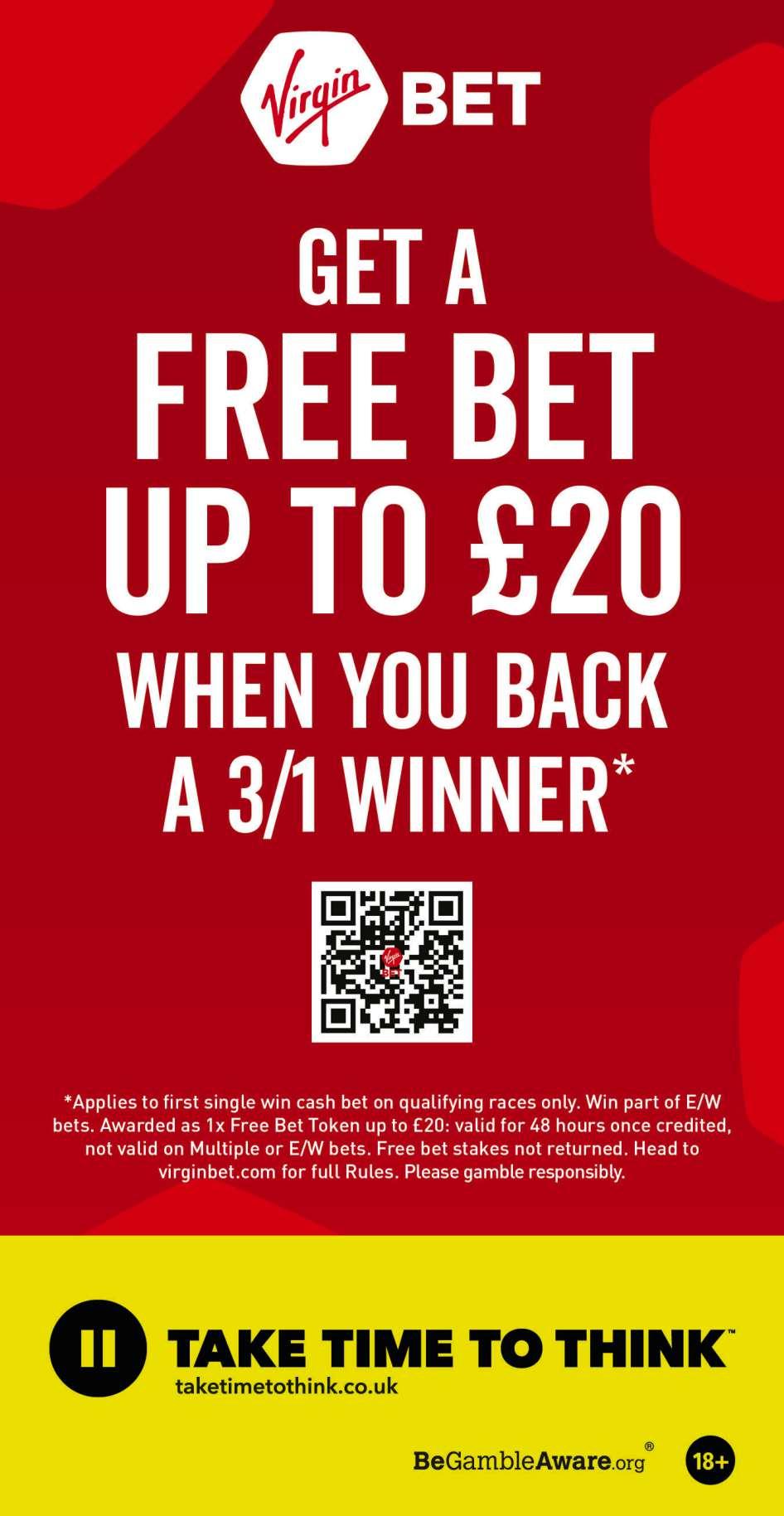 Seventh Race 4.39 THE VIRGIN BET FREE BETS FOR WINNERS HANDICAP STAKES (CLASS 4) Distributed in accordance with the Stakes and Prize Money Code. £5616 to the winning horse The second to receive £2636, the third £1318 the fourth £659 the fifth £300 and the sixth £300 for three yrs old and upwards, Rated 61-80 (also open to such horses rated 81 and 82; such horses rated 60 and below are also eligible see Standard Conditions). £50 stake if the horse is rated 61 or higher or £10 stake if the horse is rated 60 or lower with £40 extra if the horse is declared to run Declare by 10.00 a.m. September 25th. Lowest weight: 4-y-o and up 8st 9lb; 3-y-o 8st 4lb Highest weight: 4-y-o and up 10st; 3-y-o 9st 9lb Penalties, after September 17th, 2022, for each race won 3yo 6lb; 4yo to 6yo 5lb; 7yo and up 4lb. 17 entries at £50 Closed September 21st, 2022. Owners Prize Money Winner £4438; Second £2218; Third £1110; Fourth £554; Fifth £240; Sixth £240 (Penalty Value £5616) SS