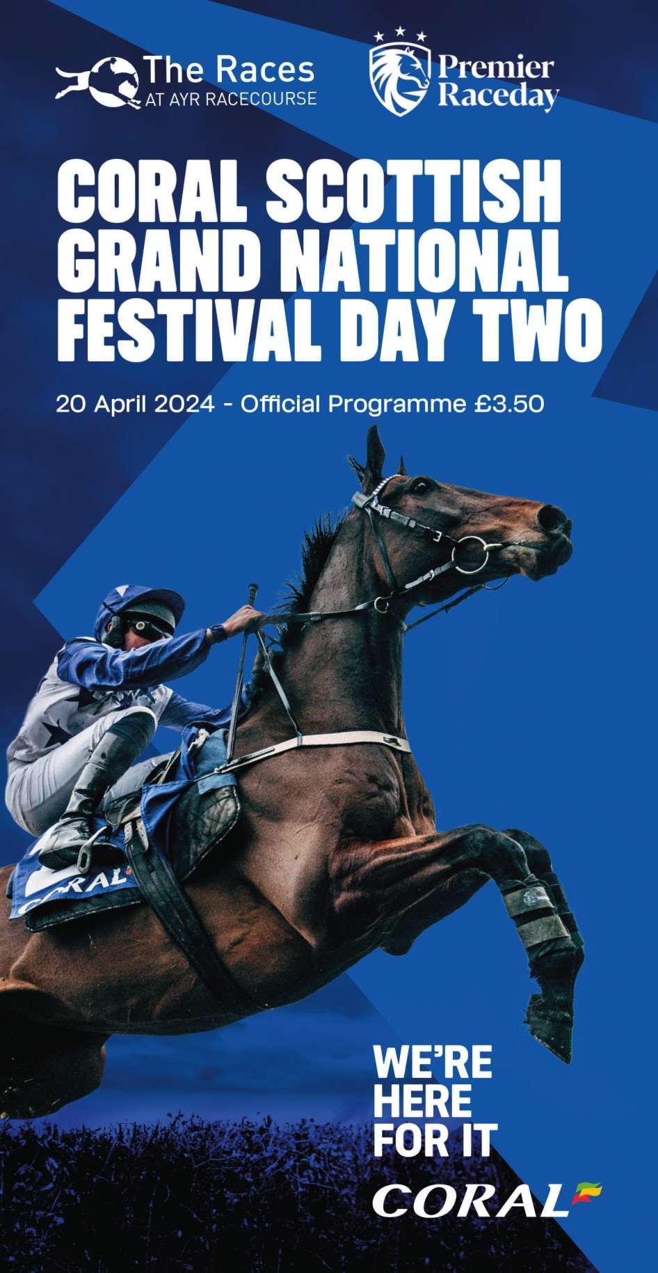 Fifth Race 3.35 - THE CORAL SCOTTISH GRAND NATIONAL HANDICAP STEEPLE CHASE (CLASS 1) (PREMIER HANDICAP) (GBB RACE) Distributed in accordance with the Stakes and Prize Money Code. £112540 to the winning horse The second to receive £42400, the third £21220, the fourth £10600, the fifth £5320, the sixth £2660, the seventh £1320 and the eighth £680 for five yrs old and upwards. Enter by noon, April 2nd and pay £300 stake, Confirm by noon, April 15th and pay £700 Declare by 10.00 a.m. April 18th. Penalties, after April 7th, 2024, a winner of a steeple chase 5lb No penalty to increase a horse’s weight above 12st. CORAL has generously sponsored this race and will present the Scottish Grand National Challenge Trophy, to be retained by the executive, and a memento to the winning owner CORAL will also present a memento to the winning trainer and jockey They will also present a cash prize of £150 to the stable employee in charge of the best turned out horse in this race. All number cloths to be carried in this race have been sponsored and will carry the name/logo of CORAL. The sponsorship payment of £500 will be distributed equally amongst all horses starting in this race in accordance with paragraphs 24 to 27 of the Stakes and Prize Money Code. This race will be restricted to 30 runners plus two reserves. The two reserves will be nominated as R31 and R32. The procedure for the allocation and operation of the reserves protocol will be as detailed in the notice headed ‘Reserves’ which has been published in The Racing Calendar and which also appears in the important notices following the Standard Conditions on the Racing Bulletin area of the BHA Racing Administration Internet site www2.racingadmin.co.uk. Trainers are reminded of the provisions of paragraph 41 of the Race Entry Code which require that they MUST notify the Racing Calendar Office IMMEDIATELY when the decision has been made not to run. This will maximise the list of runners and determine whether the weights will need to be raised. The British Horseracing Authority will modify the Rules of Racing as a consequence of providing two reserves for the Coral Scottish Grand National Handicap Steeple Chase. The penalty referred to under Rule will be waived for any horse which is deemed a non-runner by 1.00pm on the day before the race. The British Horseracing Authority has modified paragraph 6 of the Weights and Handicapping Code for the purposes of this race, such that racecourse performances up to and including the Sunday after Closing may be taken into account. The British Horseracing Authority has modified the Declaration of Jockey section of the Race Entries Code and the Division of Races section of the Race Administration Code of the Rules of Racing for the purposes of this race. PLEASE NOTE: A novice horse shall only be qualified to run in this race if it has run a minimum of three times in Steeple Chases in Great Britain, Ireland or France in accordance with paragraph 15 of the Weights and Handicapping Code 70 entries, 34 at £300, 36 at £1000 - Closed April 2nd, 2024. Owners Prize Money Winner £86080; Second £35480; Third £17740; Fourth £8880; Fifth £4440; Sixth £2220; Seventh £1100; Eighth £560. (Penalty Value £112540)