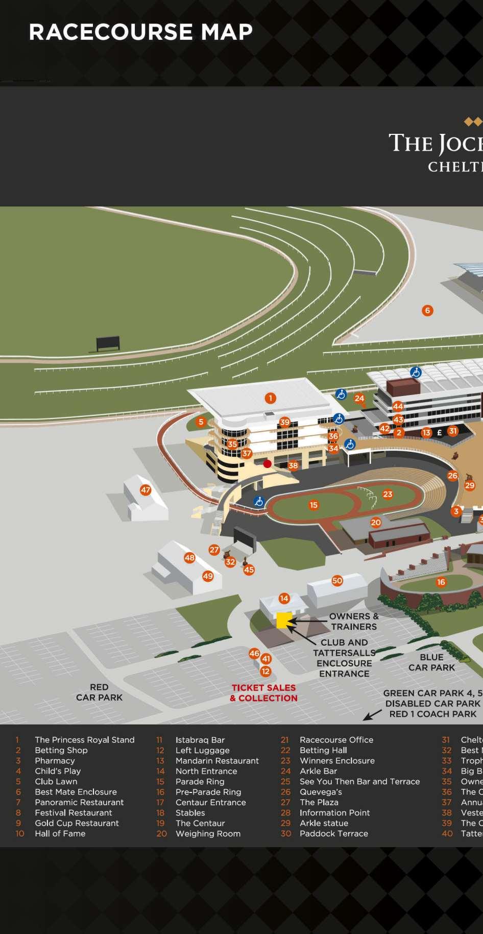 The Racecourse would be grateful if you would observe all Health & Safety requirements whilst you are at Cheltenham Racecourse The emergency exits from the bars onto the grandstand steppings are painted yellow and we would request that you do not stop whilst in this area. We would also request that only those that are disabled use the disabled viewing ramp and that parents keep a close eye on all children and prevent them from climbing the running rails and getting on to the actual racecourse We would also like to remind racegeors that the first aid room is located above the parade ring behind the See You Then Bar