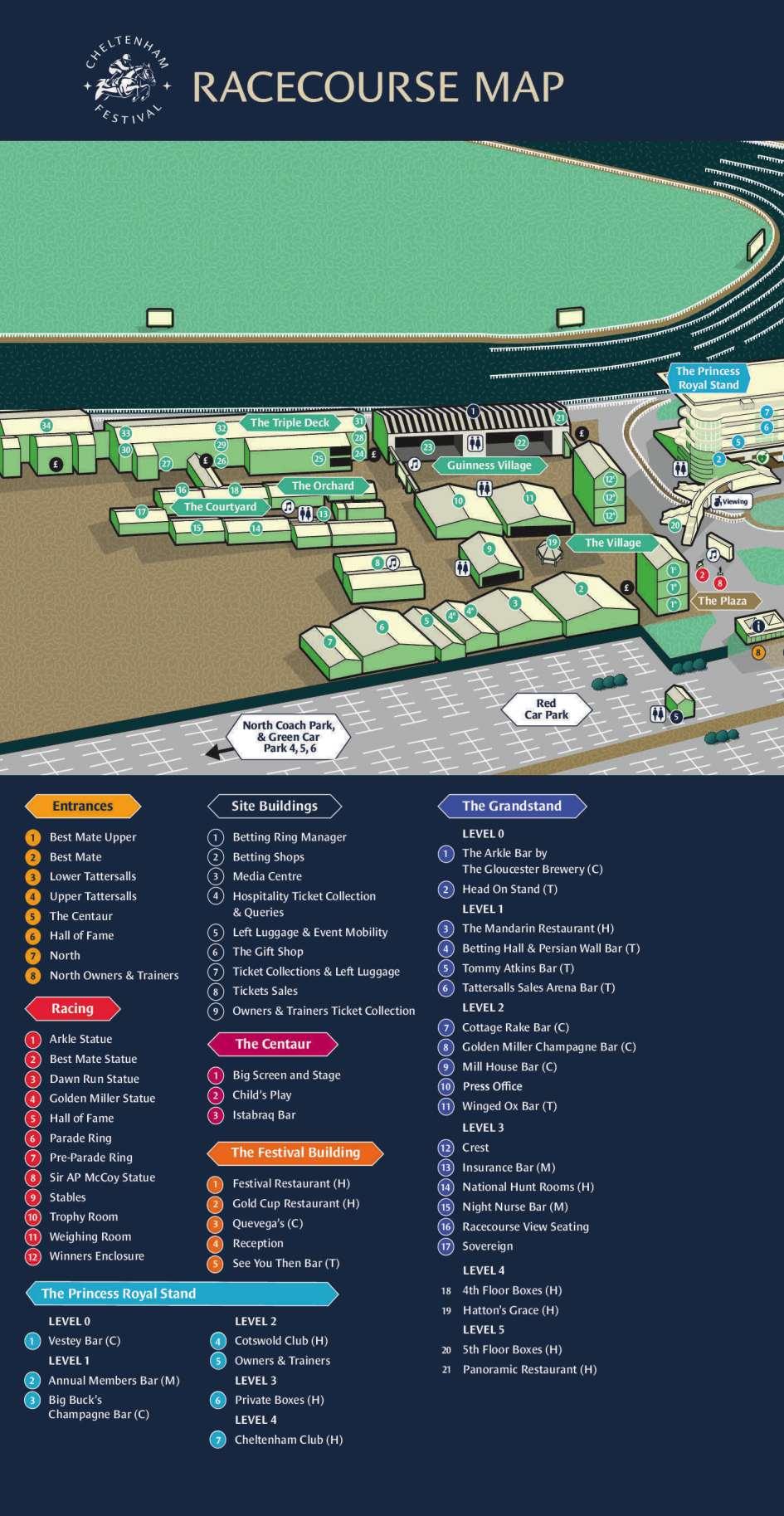 The Racecourse would be grateful if you would observe all Health & Safety requirements whilst you are at Cheltenham Racecourse. The emergency exits from the bars onto the grandstand steppings are painted yellow and we would request that you do not stop whilst in this area. We would also request that only those that are disabled use the disabled viewing ramp and that parents keep a close eye on all children and prevent them from climbing the running rails and getting on to the actual racecourse We would also like to remind racegoers that the first aid room is located above the parade ring behind the See You Then Bar.
