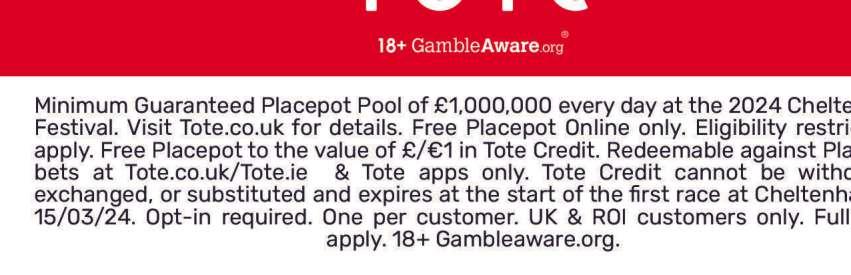 Sixth Race 4.50 - THE JOHNNY HENDERSON GRAND ANNUAL CHALLENGE CUP HANDICAP STEEPLE CHASE (CLASS 1) (PREMIER HANDICAP) (GBB RACE) Distributed in accordance with the Stakes and Prize Money Code. £70337 to the winning horse The second to receive £26500, the third £13262, the fourth £6625, the fifth £3325, the sixth £1662, the seventh £825 and the eighth £425. for five yrs old and upwards Enter by noon, February 20th and pay £155 stake, Confirm by noon, March 7th and pay £470, Declare by 10.00 a.m. March 11th. Penalties, after February 25th, 2024, a winner of a steeple chase 5lb No penalty to increase a horse’s weight above 12st. The Challenge Cup, which was subscribed for by the Town of Cheltenham, is to be held by the winning owner until February 1st, 2025. Presentations will be made to the winning owner, trainer and jockey, and an award of £200 will be given to the member of racing staff judged to be in charge of the best turned out horse in this race The British Horseracing Authority will amend paragraphs 28 to 32 of the Weights and Handicapping Code and the Declaration of Jockey section of the Race Entries Code in the event that raising of the weights at the 24-hour stage proves necessary. This race will be restricted to 20 runners plus two reserves The two reserves will be nominated as R21 and R22. The procedure for the allocation and operation of the reserves protocol will be as detailed in the notice headed ‘Reserves’ which has been published in The Racing Calendar and which also appears in the reserves notice in the Conditions For Entry Section, accessed from the Information menu on the BHA Racing Administration Internet site (www2.racingadmin.co.uk). Trainers are reminded of the provisions of paragraph 41 of the Race Entry Code which require that they MUST notify the Racing Calendar Office IMMEDIATELY when the decision has been made not to run. This will maximise the list of runners and determine whether the weights will need to be raised. The British Horseracing Authority will modify the Rules of Racing as a consequence of providing two reserves for this race The non runner penalty will be waived for any horse which is deemed a non-runner by 1.00 p.m. the day before the race. PLEASE NOTE: Any horse for whom a confirmation of entry has been submitted will not be permitted to declare to run if, at the time fixed for declaration, it has been declared to run in any other race at this season’s Cheltenham Festival, which has yet to take place. (This will apply whether subsequently declared a non-runner or not, unless the horse has been eliminated from a race, or declared as a reserve and not been made a non-runner.) The British Horseracing Authority has modified paragraph 6 of the Weights and Handicapping Code for the purposes of this race, such that racecourse performances up to and including Sunday after Closing may be taken into account. A Confirmation of Entry will not be accepted for any horse for which Medical Records are not submitted to the BHA by 5th March, 2024 with a further update to be submitted by 6.00pm on the day before the race PLEASE NOTE: A novice horse shall only be qualified to run in this race if it has run a minimum of three times in Steeple Chases in Great Britain, Ireland or France in accordance with paragraph 15 of the Weights and Handicapping Code 38 entries, 11 at £155, 27 at £625. - Closed February 20th, 2024. Owners Prize Money. Winner £53800; Second £22175; Third £11088; Fourth £5550; Fifth £2775; Sixth £1388; Seventh £688; Eighth £350. (Penalty Value £70337.50)