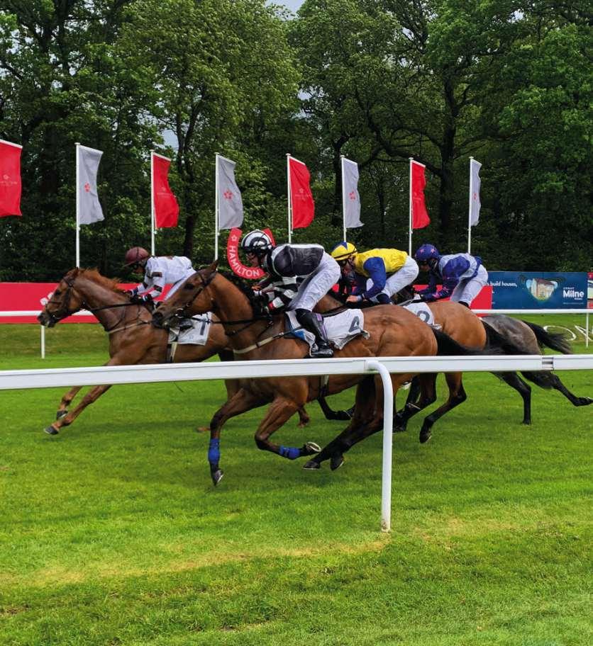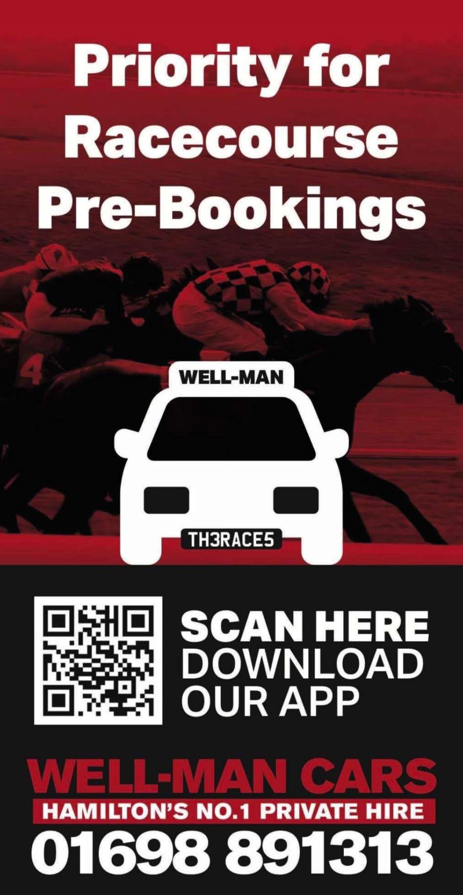 Fourth Race 4.00 - THE FOLLOW US ON X @hamiltonparkrc HANDICAP STAKES (CLASS 5) Distributed in accordance with the Stakes and Prize Money Code £4187 to the winning horse The second to receive £1964, the third £981, the fourth £491 and the fifth £244. for four yrs old and upwards, Rated 49-68 (also open to such horses rated 48 and below). £40 stake if the horse is rated 49 or higher, or £8 stake if the horse is rated 48 or lower with £32 extra if the horse is declared to run Declare by 10.00 a.m. June 16th. Lowest weight 8st 4lb; Highest weight 9st 9lb Penalties, after June 7th, 2025, for each race won 4yo to 6yo 5lb; 7yo and up 4lb Hamilton Park executive will present a memento to the winning owner In addition, they will present a cash prize to the person in charge of the horse judged to be the best turned out. 9 entries at £40. - Closed June 12th, 2025. Owners Prize Money. Winner £3303; Second £1652; Third £826; Fourth £413; Fifth £206. (Penalty Value £4187.20) Weights lowered 1lb. SS