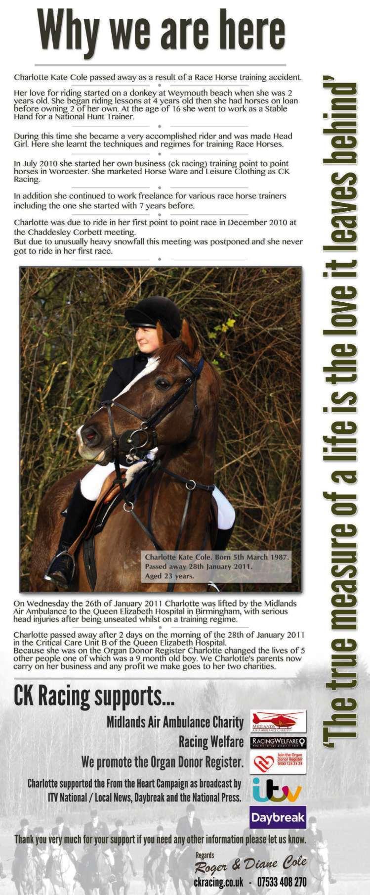 Eighth Race 4.17 - THE CHARLOTTE COLE AND BECKY ROWLAND MEMORIAL FILLIES’ “JUNIOR” NATIONAL HUNT FLAT RACE (CLASS 5) (GBB RACE) Distributed in accordance with the Stakes and Prize Money Code £2450 to the winning horse The second to receive £1129, the third £564 and the fourth £282. for three yrs old fillies only, which have not won a Junior National Hunt Hurdle race, and which have not run under any recognised Rules of Racing, except Junior NH Hurdle races, National Hunt Flat races, Irish National Hunt Flat races or French AQPS Flat races. Enter by noon, October 24th and pay £22 stake, Declare by 10.00 a.m. October 28th. Weights: 11st each Penalties, a winner of a race 7lb Of 2 races 10lb The Riders’ Allowances under paragraph 53 of the Weights and Handicapping Code may be claimed in this race Friends and Family of The Late Charlotte Cole and Becky Rowland have generously sponsored this race and will present a memento to the winning owner and a £50 cash prize to the stable employee responsible for the best turned out horse 19 entries at £22. - Closed October 24th, 2025. Owners Prize Money. Winner £1878; Second £939; Third £469; Fourth £235. (Penalty Value £2450.70) SEE PAGE 46 FOR THIS RACE.