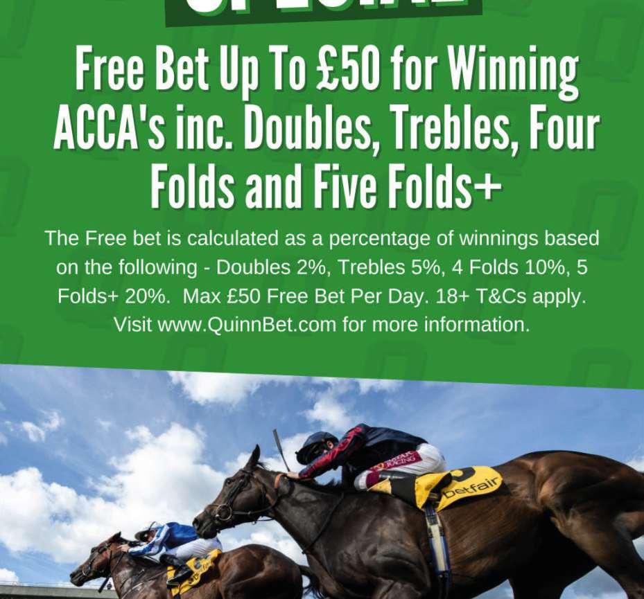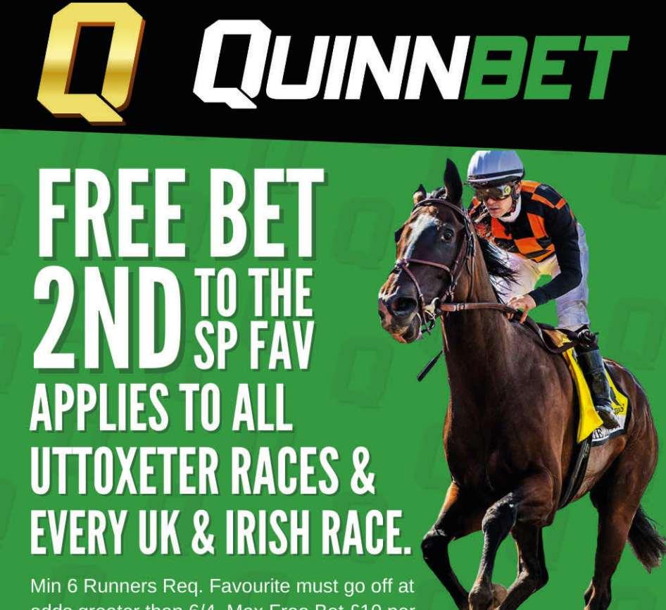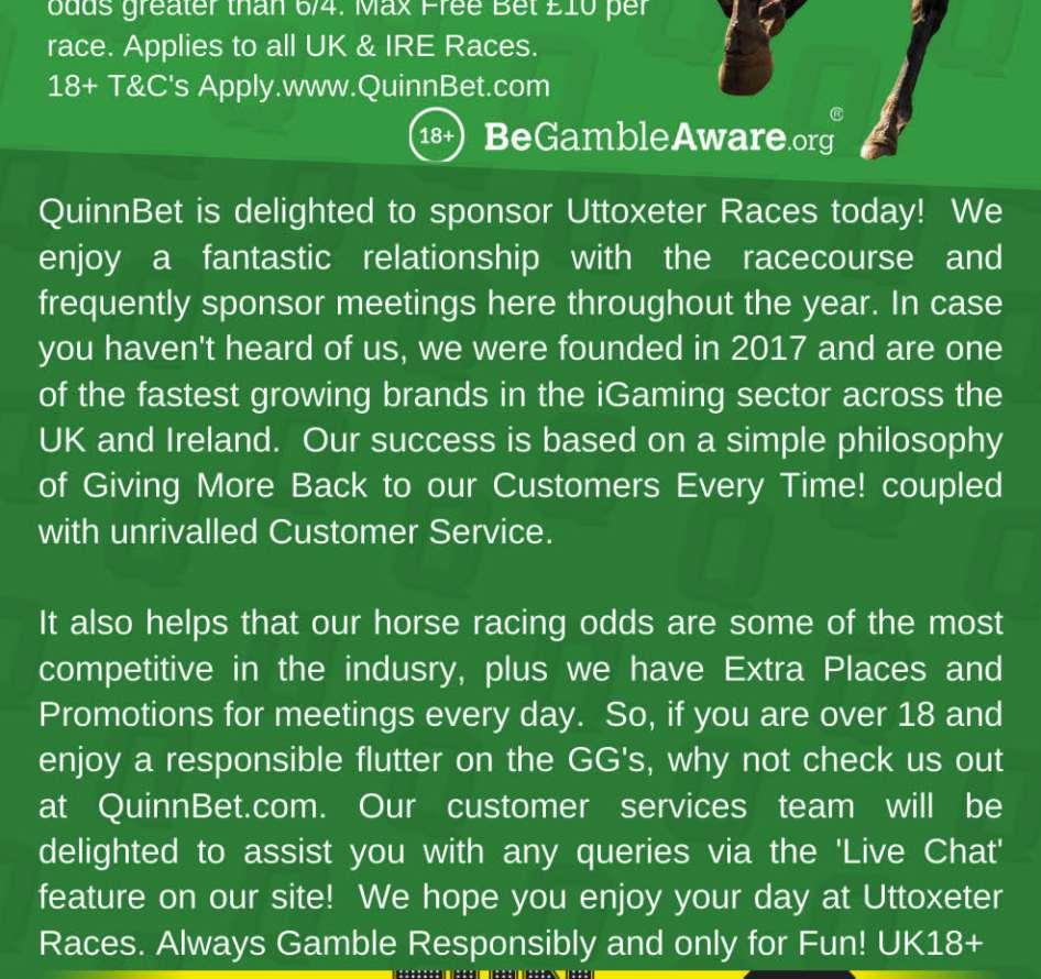 Seventh Race 4.45 THE QUINNBET DAILY FREE BET OPEN NATIONAL HUNT FLAT RACE (CLASS 5) (Category 1 Elimination) (GBB RACE) Distributed in accordance with the Stakes and Prize Money Code. £2614 to the winning horse The second to receive £1204, the third £601 and the fourth £301. for four, five and six yrs old only, which have not run under any recognised Rules of Racing, except National Hunt Flat races, Irish National Hunt Flat races or French AQPS Flat races. Enter by noon, October 22nd and pay £24 stake, Declare by 10.00 a.m. October 26th. Weights: 4-y-o 10st 13lb; 5-y-o and 6-y-o 11st Fillies and mares allowed 7lb Penalties, a winner of a race 7lb Of 2 races 10lb Of 3 races 12lb The Riders’ Allowances under paragraph 53 of the Weights and Handicapping Code may be claimed in this race. QUINNBET have kindly sponsored this race and will give a cash prize to the person who, in their opinion, is responsible for the horse judged to be the best turned out in this race. 36 entries at £24. Closed October 22nd, 2022. Owners Prize Money. Winner £2003; Second £1002; Third £501; Fourth £251. (Penalty Value £2614.08)