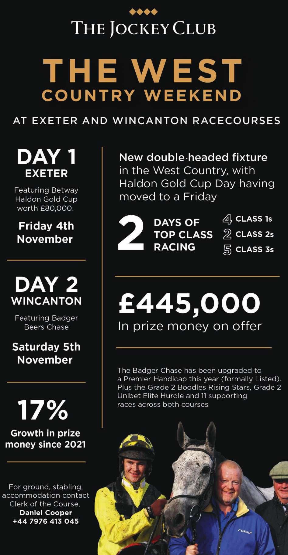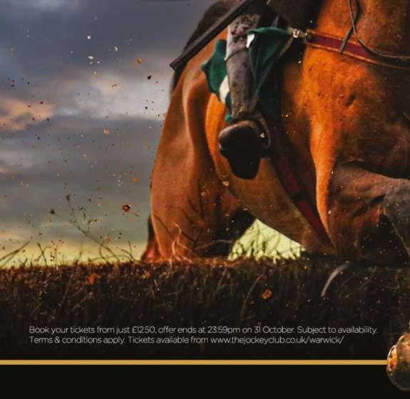 FIXTURES *All fixtures & sponsors are correct at the time of printing Monday 19th September Racing TV Grand Season Opener Tuesday 20th September Poundland Grand Season Opener Thursday 29th September The Great Autumn Meeting Tuesday 1st November – Stan Mellor Chase Day Wednesday 16th November – Highflyer Chase Day Thursday 8th December Eventmasters Christmas at the Races Saturday 31st December Poundland New Year’s Eve Raceday 2022 Fixtures Saturday 14th January Wigley Group Classic Chase Day Wednesday 25th January Members Race Day Saturday 11th February Kingmaker Chase Day Friday 24th February Fabulous Fiver Friday Sunday 12th March – Four-Legged Friend Day Wednesday 22nd March Afternoon At The Races Thursday 30th March St Mary’s Land Day Thursday 27th April Charity Day Monday 1st May – Kids Carnival Day Saturday 13th May – Ladies Night Wednesday 24th May Proudly Warwick Wednesday 31st May Wigley Property Night 2023 Fixtures THEJOCKEYCLUB.CO.UK/WARWICK