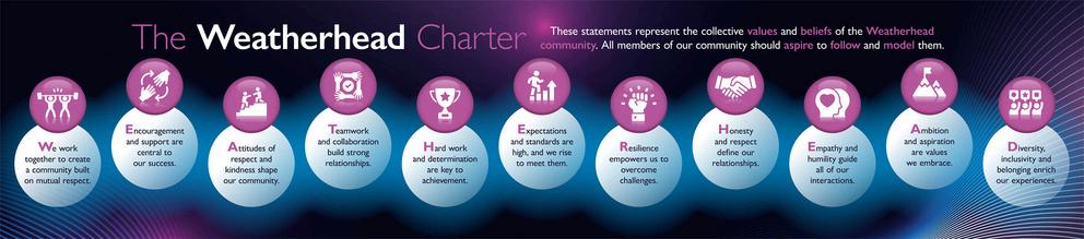 The Weatherhead Charter represents the collective aspirations and commitments of the school community. It outlines the behaviour and values to which members of the community should adhere, and serves as a guide by which we can hold each other to account. By applying these principles, we can work together towards a shared goal of creating a supportive, inspiring, and successful environment for all.