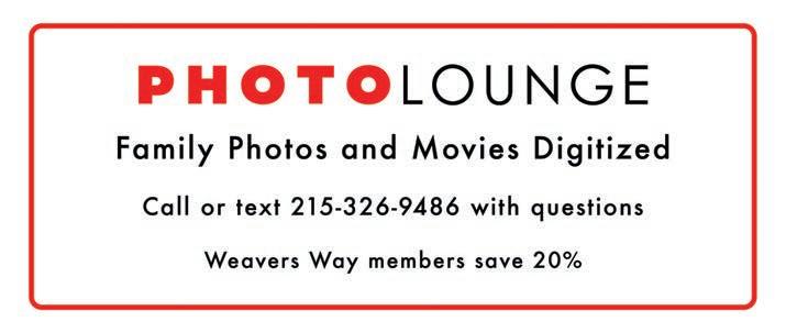 Advertising for each issue is due the 1st of the preceding month, e.g., Dec. 1 for January. Ad rates are online at www. weaversway.coop/shuttle, or call 215843-2350, ext. 314, or email advertising@ weaversway.coop. Advertised products or services may not be construed as endorsed by Weavers Way Co-op.