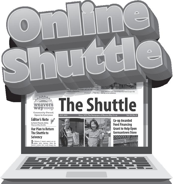Advertising for each issue is due the 1st of the preceding month, e.g., Dec. 1 for January. Ad rates are online at www. weaversway.coop/shuttle, or call 215843-2350, ext. 314, or email advertising@ weaversway.coop. Advertised products or services may not be construed as endorsed by Weavers Way Co-op.