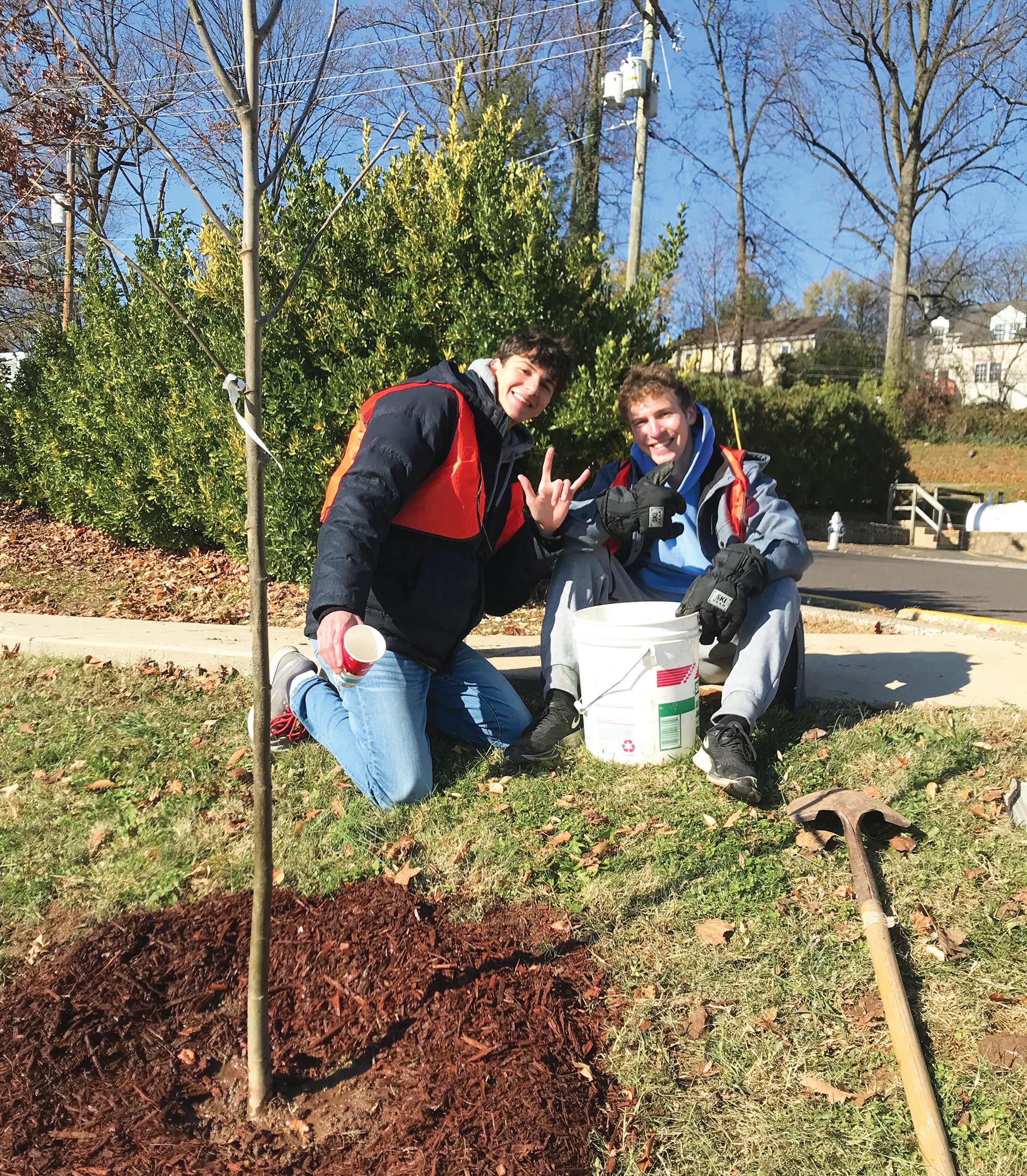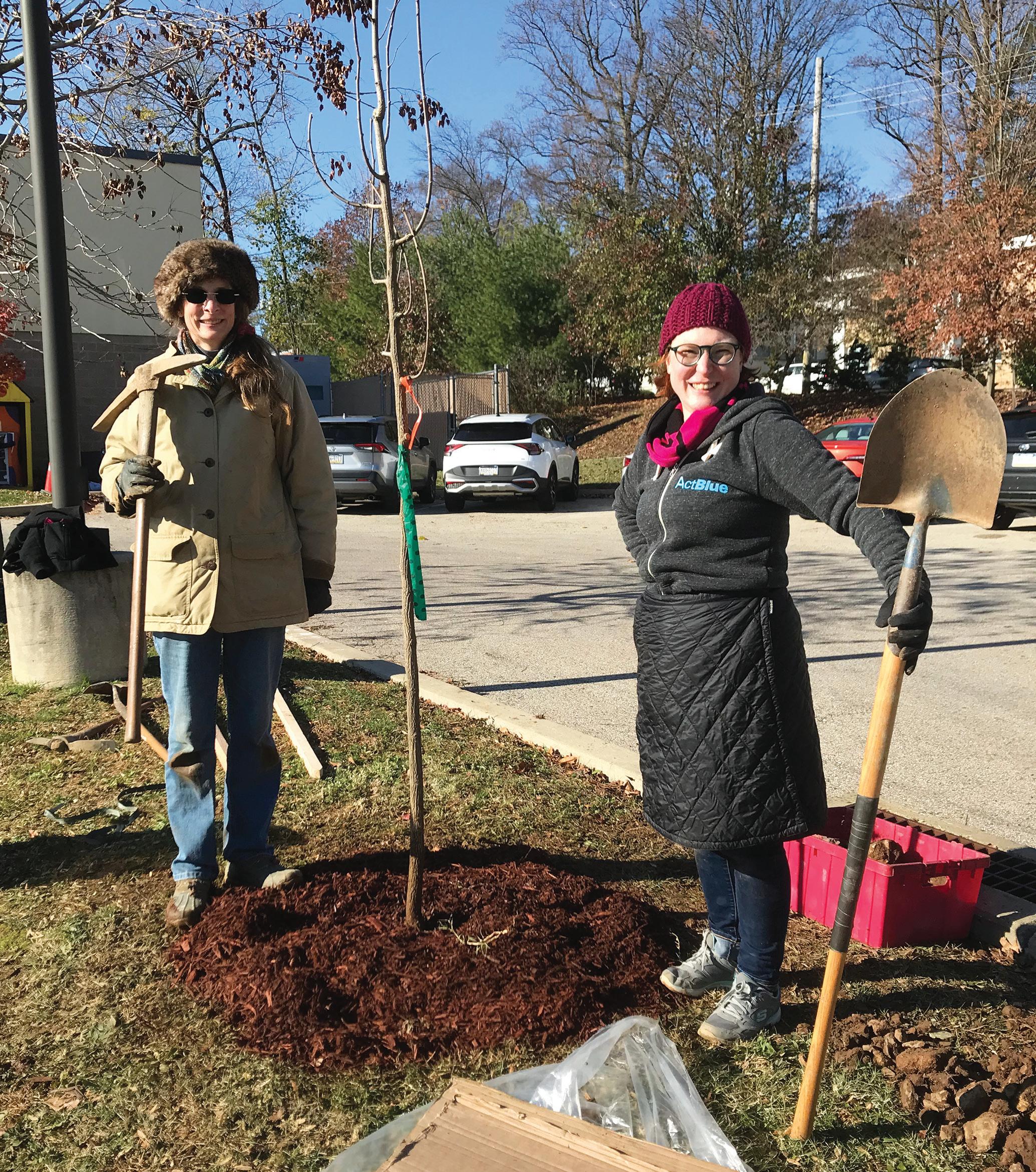 A group of helpers gathered outside Weavers Way Ambler on Nov. 19 to plant trees in the parking lot the Co-op shares with Ambler Beverage Exchange. Above left, Catherine Jacobs (left), and Amanda Gilmore wield the pickaxe and shovel they used to plant their sapling. Above right, Wissahickon High students and National Honor Society members Josh Sasson (left) and Ethan Werner pose by the tree they planted. The trees were donated by the borough, with planting coordinated by Ambler's Environmental Advisory Council.