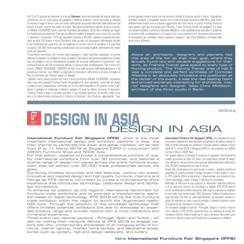 IN ASIA International Furniture Fair Singapore (IFFS), che rappresenta la più importante piattaforma internazionale ed espositiva del settore design in Asia, il canale principale per penetrare i mercati asiatici e globali, si terrà dall’8 all’11 marzo 2018 a Singapore EXPO in concomitanza con ASEAN Furniture Show e NOOK Asia. Per questa edizione si prevede la presenza di espositori internazionali di qualità provenienti da oltre 30 paesi, che esporranno prodotti di design che, all’interno del panorama internazionale dell’arredamento attireranno oltre 20.000 professionisti da tutto il mondo. Grazie alla combinazione tra pezzi iconici e novità, i visitatori avranno la possibilità di scoprire prodotti di design innovativi e di alta qualità, in quanto IFFS intende offrire un’esperienza multisensoriale che presenti al suo interno tecnologia, celebri il design e favorisca le connessioni. Nell’ottica di rafforzare la sua posizione di riferimento nelle fiere dell’area e di un approccio sempre più tecnologico e digitale, IFFS 2018 sarà la prima manifestazione dell’arredamento della regione a lanciare la cosiddetta area della 'Augmented reality' (AR). Attraverso l’utilizzo di questa tecnologia simulata che offre un potenziale illimitato, gli espositori saranno in grado di mostrare un vasto range di prodotti e i visitatori potranno vivere un’esperienza più interattiva e immersiva. Tre nuovissimi padiglioni nazionali – Portogallo, Spagna e Turchia - faranno il loro debutto a IFFS 2018 e presenteranno una selezione di arredi, illuminazione d’interni, finiture tessili per la casa e accessori decorativi come ceramiche, servizi di lusso per la tavola tra cui posateria e coltelleria.