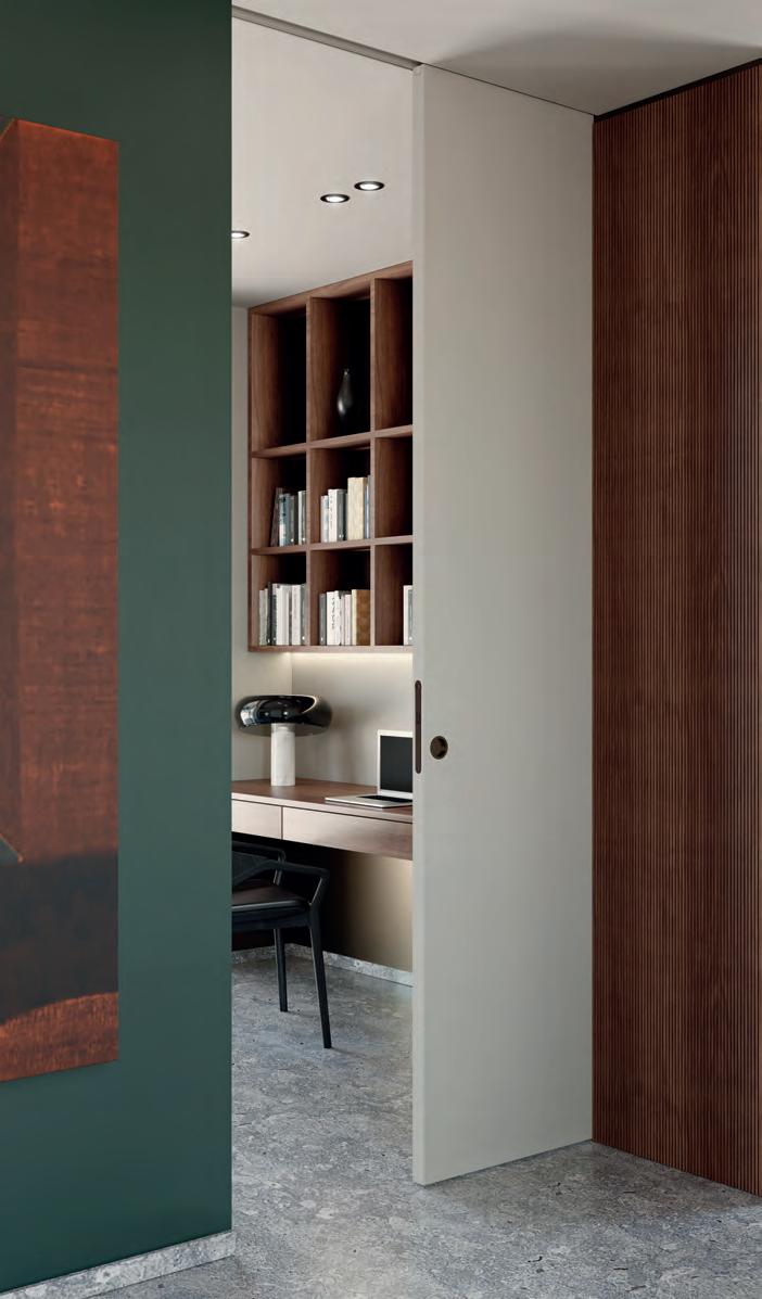WHILE REVERSA 44 IS A SOLUTION FOR AN ACCESSIBLE DESIGN, IN TERMS OF COST AND DIMENSIONS THAT ALLOW FOR A MORE IMMEDIATE INSTALLATION, LINEAR SWING, WITH ITS QUALITY AND GREAT VERSATILITY, REPRESENTS THE IDEAL ARCHITECTURAL SOLU TION FOR CONFIGURING AND CUSTOMISING SPACES WITH STYLE RIGHT FROM THE PLANNING STAGE. THANKS TO THE INSTALLATION OF A DOOR PANEL THAT FITS PERFECTLY INTO THE WALL IN WHICH IT IS INSERTED, IT GIVES THE HOME AN INDISPUTABLE CONTEMPO RARY TOUCH.