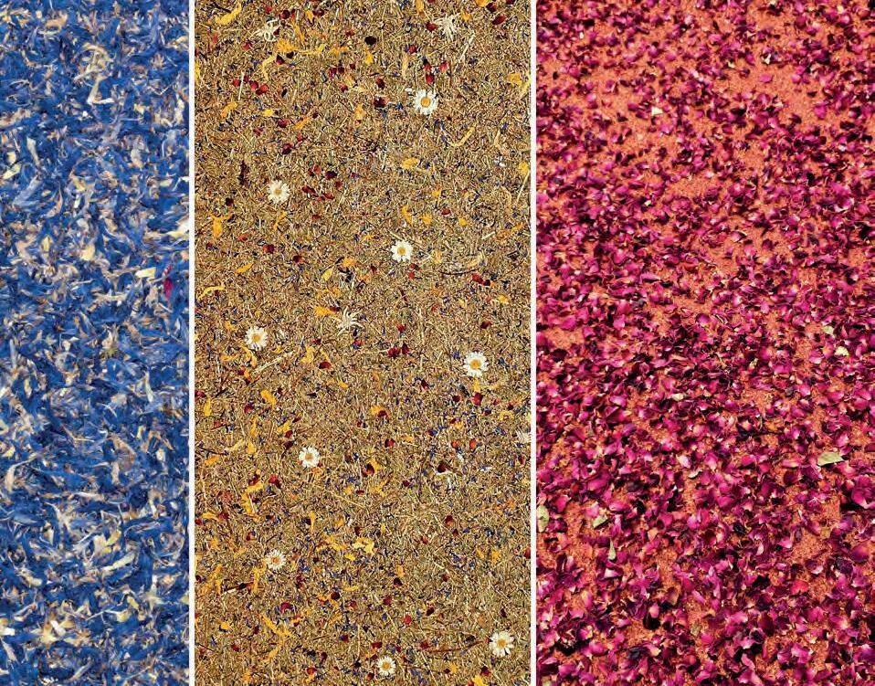 THE DELICATELY SCENTED MEADOW HERB DECORATIONS ARE MADE FROM DRIED HERBS, ENRICHED HERE AND THERE WITH FLOWERS, ALSO DRIED, SUCH AS EDELWEISS, DAISIES, COR NFLOWERS, ROSES AND HEATHER. THE FLORAL DECORATIONS KORNBLUAMA BLUE AND ROASNBLIATN, ON THE OTHER HAND, ARE MADE EXCLUSIVELY FROM DRIED CORNFLOWER AND ROSE PETALS. WITH THEIR INTENSE BLUE AND PINK COLOUR, THEY ARE A REAL FEAST FOR THE EYES. THE FLEXIBLE MATERIAL IS SUPPLIED IN ROLLS AND CAN, THEREFORE, ALSO BE USED ON SHAPED PIE CES. THE BACK IS PROVIDED WITH A LAYER OF LINEN FABRIC AND IS 1.36 M WIDE.