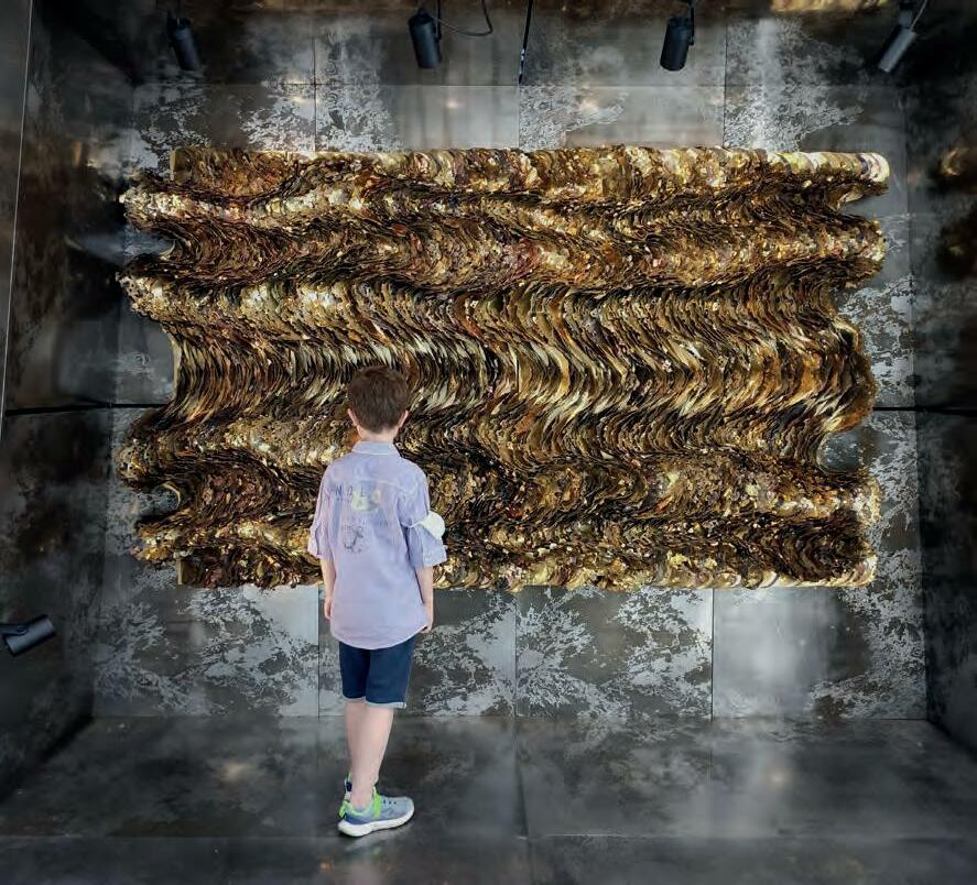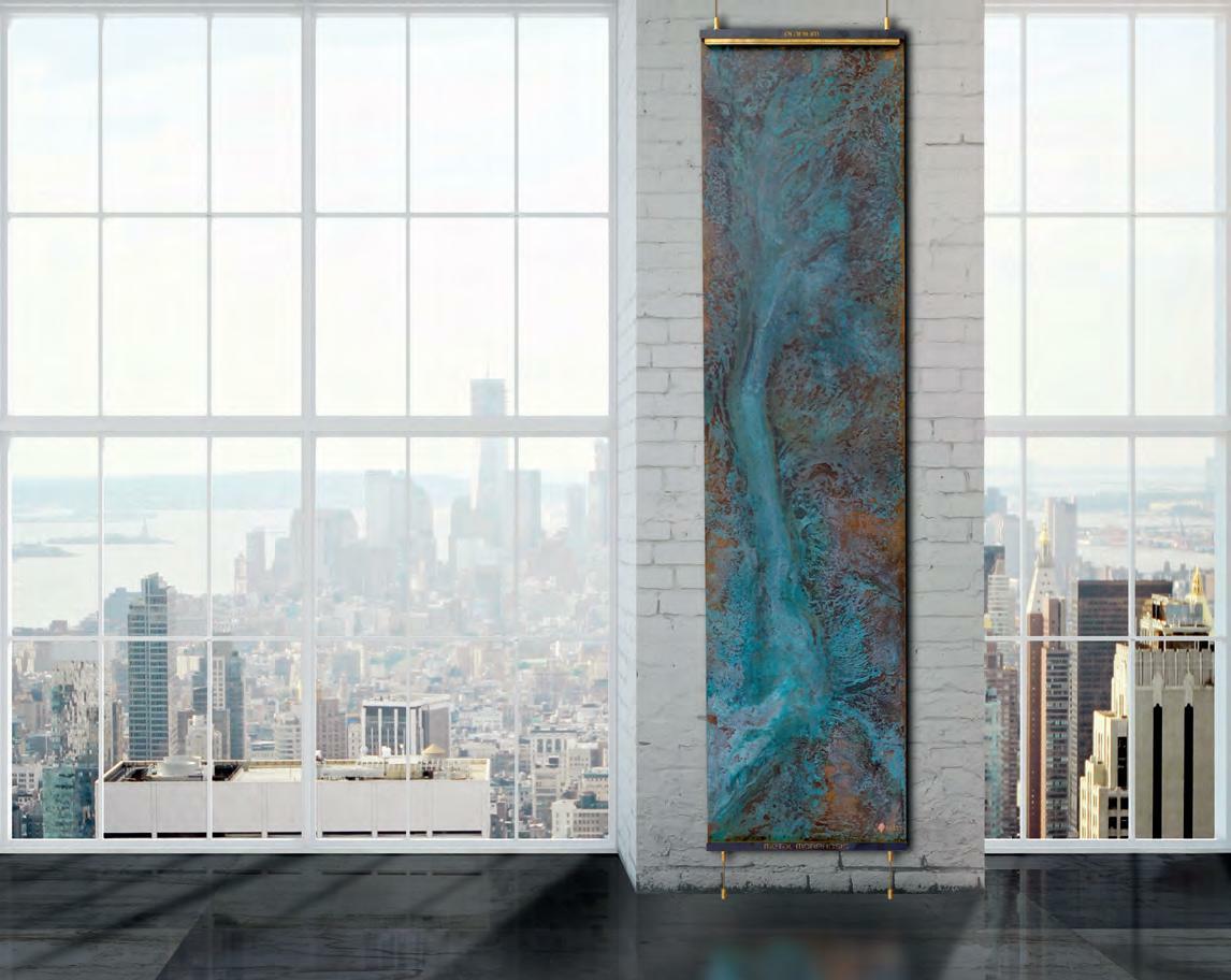MADE OF 200 BRASS SHEETS, LASER-CAR VED, MODELLED, ASSEMBLED AND OXIDI SED BY HAND, MEASURING 1.7X2.7 M IN SIZE, IT CONTAINS THE TECHNICAL MASTERY OF THE NOW 56 YEARS OF EXPERIENCE THAT DISTINGUISHES OUR COMPANY. THE WAVES LIVE ON THROUGH TIME THANKS TO THE OXI DATION THAT HAS ERODED THEM, LIKE SEA SALT ON A CORAL, LIKE ANCIENT LACE. THE STARS OF IŞIL ÇAĞATAY'S MAVI SERIES ARE THE CALYPSO TAPESTRIES (48X197 CM) AND THE LARGE FRAMED ART PLATES (1X2 M). THE THIN COPPER AND BRASS 'SHEETS' REVEAL AN UNEXPECTED RIOT OF COLOURS ON THEIR SURFACES.