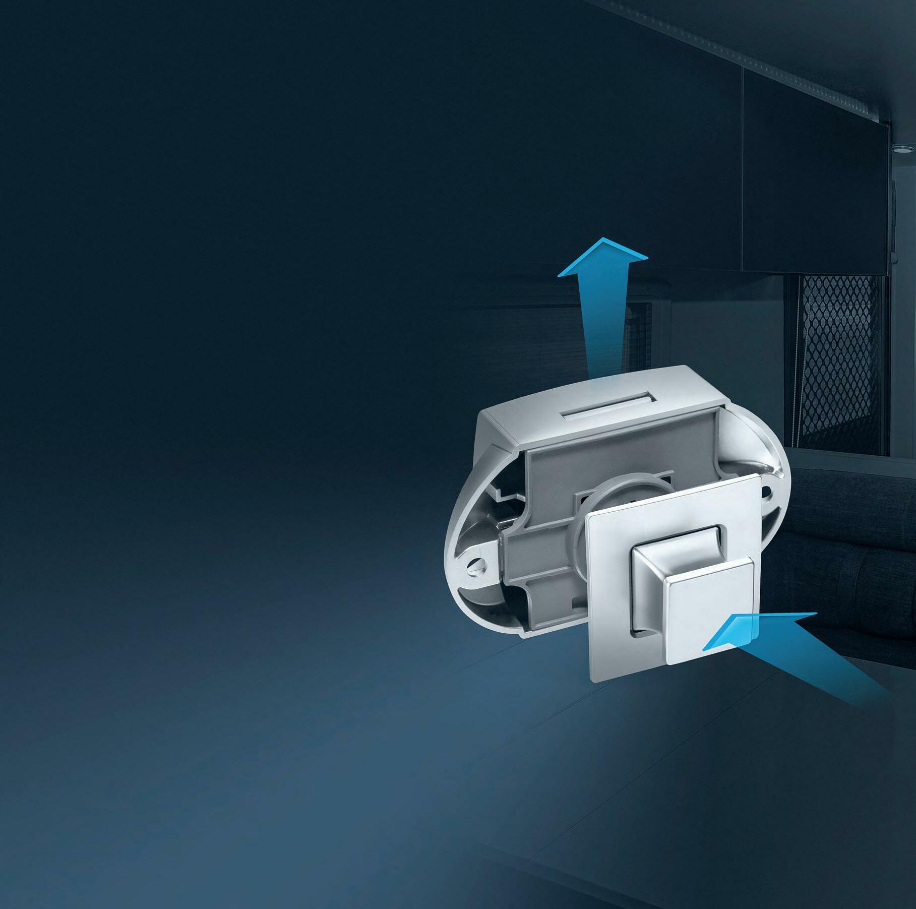 Push Lock sono serrature a pressione pensate per i camper, che forniscono una chiusura affidabile e sicura dei mobili durante i tragitti. Basta una leggera pressione sul pulsante per aperture e chiusure agevoli e comode. Quando le serrature a pressione sono in posizione di chiusura si fondono in maniera armoniosa con la superficie dell’anta, conferendo un look elegante e sofisticato all’ambiente