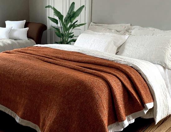 SPINNING AND WEAVING NO HARMFUL CHEMICALS ARE INVOLVED, IT IS BIO DEGRADABLE. IT THEREFORE REPRESENTS THE BEST ANSWER TO THE NEED TO FEEL NATURE IN CONTACT WITH THE SKIN FOR SUMPTUOUS SATIN SHEETS AND BEDCOVERS IN FLANDERS LINEN, MADE EVEN MORE PRECIOUS BY EMBROI DERY AND GUIPURE. FOR THE BATHROOM AND SPA, THE SETS ARE IN SOFT SPONGE OR HONEYCOMB-WORKED LINEN, SOFT, WHICH DRIES AND CLEAN SES, SWEET LIKE A CUDDLE ON THE SKIN. FABRICS WITH AN ANCIENT IMPRINT BUT WITH A MODERN ELEGANCE TO DRESS THE TABLE WITH LIGHT BROCADES AND COTTON SATIN ENRICHED BY THE INSERTION OF LINEN THREADS THAT GIVE LIFE TO TACTILE RELIEFS TO BE DISCOVERED AND WHICH ONCE AGAIN BRING US BACK TO NATURE. MIX LINEN WITH WOOL IN COMFORTABLE PLAIDS, WITH ‘RAW’ TEXTURES, BUT WITH AN UNEXPECTEDLY SWEET TOUCH. EXAMPLES FROM THE COLLECTIONS OF SELECTED ITALIAN COMPANIES, F.LLI GRAZIANO WHO, FOLLOWING THE FAMILY TRADITION, PROCESSES THE BEST FLAX FROM EUROPEAN CROPS, GUARANTEED MASTERS OF LINEN® BY THE EUROPEAN CONFEDERATION FOR FLAX AND HEMP/CELC.