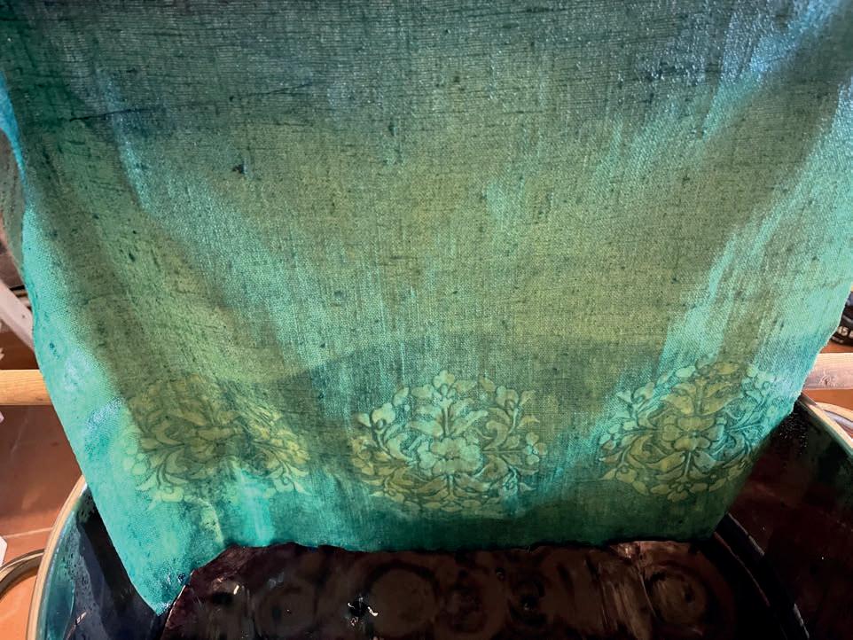 Indigo, through a complex process, is ground into a powder and stored usually in blocks, so that it can be transported. Once at the dyehouse, an alkalinizer (the pH must be between 9 and 12) and an antioxidant must be added; within a few hours, the dye bath turns yellow with a pearly surface called "indigo flower." At this point, the bath is ready for immersion of the materials. After a few minutes, upon contact with oxygen, the dye will first turn yellow, then green, and finally blue. After the first bath, the material will be light blue, but after several immersions, intense blues will become almost black.