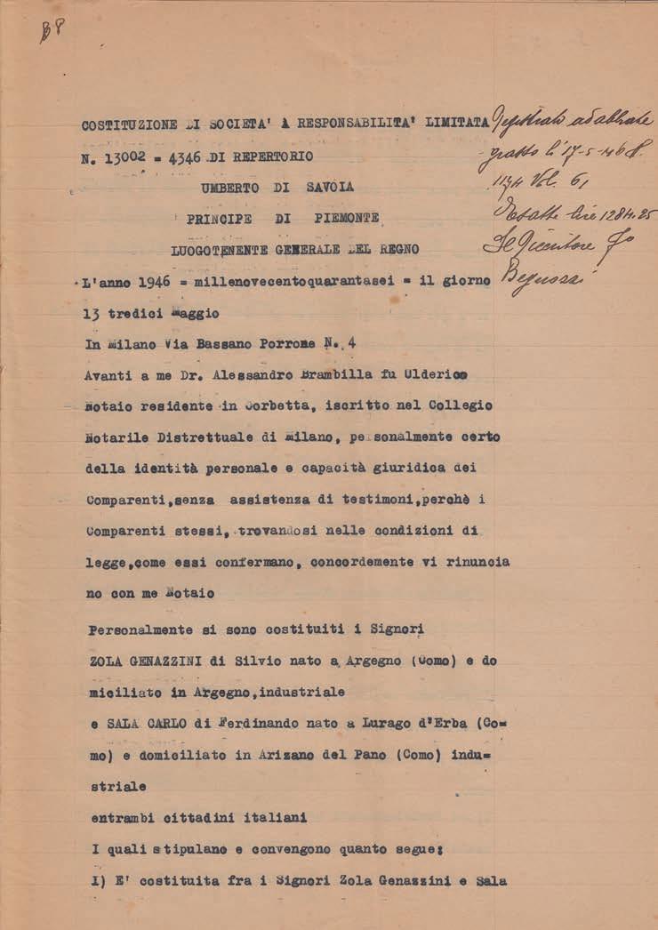 Sono trascorsi ottant’anni da quando, nel 1946, Carlo Sala, allora ventenne, avviò la propria attività imprenditoriale fondando una piccola tintoria alle Fornaci di Briosco. L’impianto iniziale, di circa 400 m², sfruttava la vicinanza del fiume Lambro per l’approvvigionamento idrico ed era dotato di attrezzature essenziali: una caldaia a legna e vasche