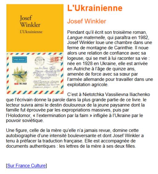 L’Ukraine en toutes lettres, Brigades éditoriales de solidarité 23 E Hommage à l'Ukraine (collectif) 25 E Journal d’une invasion, Andreï Kourkov 26 E Lexique de mes villes intimes, Yuri Andrukhovych 27 E Jours gris et nuages d’acier sur l’Ukraine, Bernard Dréano (auteur français) 28 T Donbass : un journaliste en camp raconte, Stanislas Asseyev 29 T La supplication : Tchernobyl, chronique du monde après, Svetlana Alexievitch 30 T L’Ukraine en toutes lettres, Brigades éditoriales de solidarité 31 T Fichez-nous la Paix !, 120 dessins - collectif 32 BD Les Cahiers ukrainiens - Journal d’un invasion, BD 33 BD Aux portes de l’Europe - Histoire de l’Ukraine, Serhii Plohky 34 H
