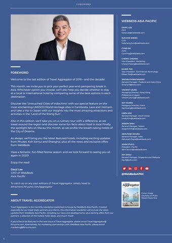FOREWORD Welcome to the last edition of Travel Aggregator of 2019 – and the decade! This month, we invite you to pick your perfect year-end pampering break in Asia. Whichever option you choose, we’ll also help you decide whether to stay at a local or international hotel by comparing some of the best options in each destination. Discover the “Untouched Cities of Indochina” with our special feature on the most enchanting UNESCO World Heritage sites in Cambodia, Laos and Vietnam, and take a trip to Japan with our insights into the most amazing attractions and activities in the “Land of the Rising Sun”. Also in this edition, we’ll take you on a culinary tour with a difference, as we travel around the region and discover some fun facts about food in Asia! Finally, the spotlight falls on Macau this month, as we profile the breath-taking hotels of the City of Dreams. As always, we’ll bring you the latest featured hotels, including exciting updates from Phuket, Koh Samui and Shanghai, plus all the news and exclusive offers from WebBeds. Have a fantastic, fun-filled festive season, and we look forward to seeing you all again in 2020! Enjoy the read! Daryl Lee CEO of WebBeds Asia Pacific