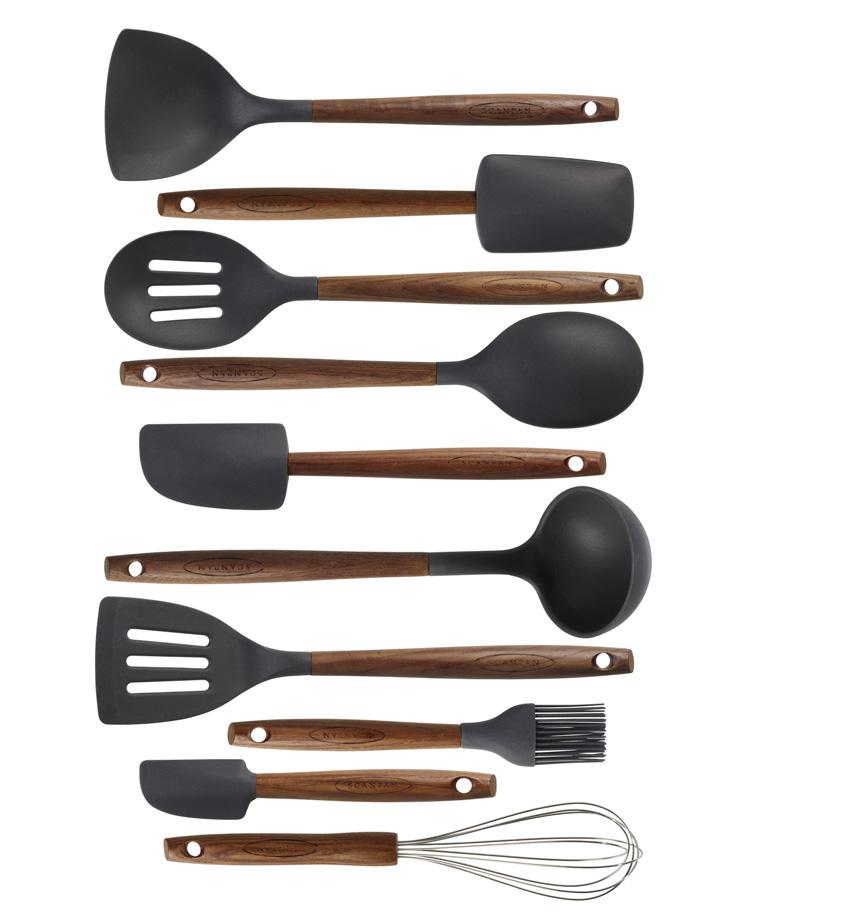 Köksredskap av rostfritt stål, klädda med silikon och handtag i värmebehandlad ask. Snygga, tåliga och klarar upphettning upp till 230°C.