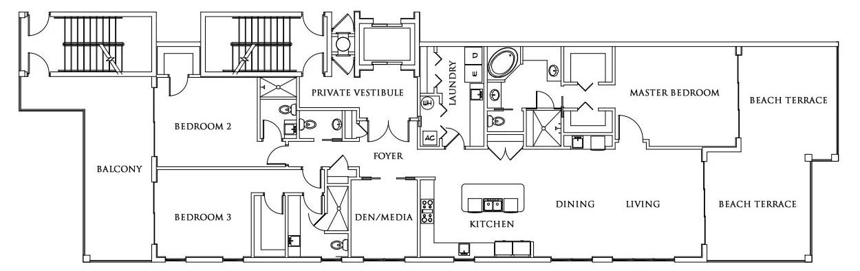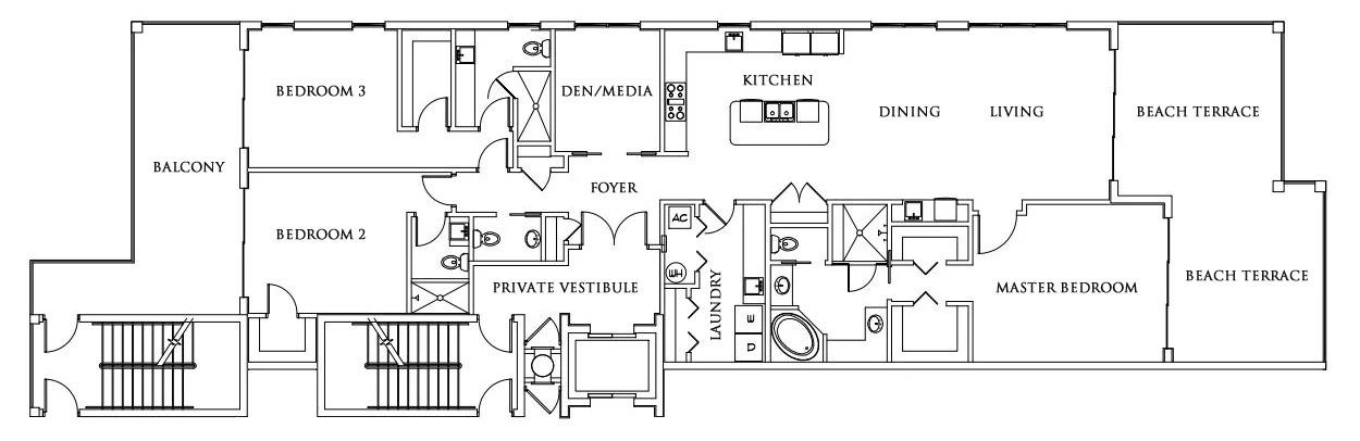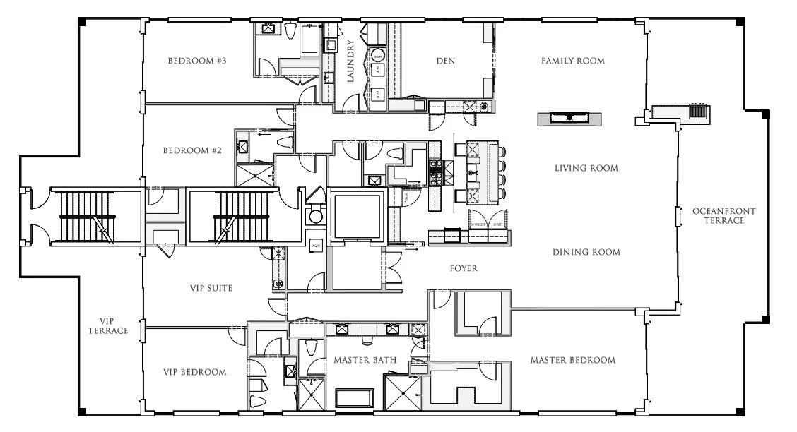 The under-construction half-floor residences in Tower 4 features 3 bedrooms and 3.5 baths along a 32-foot wide single floor with an expansive terrace, all thoughtfully designed to balance refined interiors with expansive coastal views and privacy.