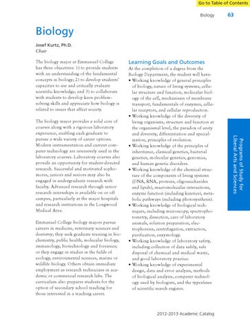 Biology Josef Kurtz, Ph.D. Chair The biology major at Emmanuel College has three objectives: 1) to provide students with an understanding of the fundamental concepts in biology; 2) to develop students’ capacities to use and critically evaluate scientific knowledge; and 3) to collaborate with students to develop keen problemsolving skills and appreciate how biology is related to issues that affect society.