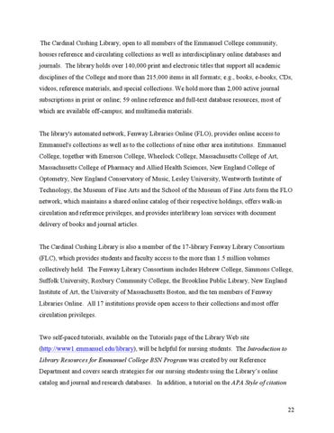 The Cardinal Cushing Library, open to all members of the Emmanuel College community, houses reference and circulating collections as well as interdisciplinary online databases and journals. The library holds over 140,000 print and electronic titles that support all academic disciplines of the College and more than 215,000 items in all formats; e.g., books, e-books, CDs, videos, reference materials, and special collections. We hold more than 2,000 active journal subscriptions in print or online; 59 online reference and full-text database resources, most of which are available off-campus; and multimedia materials. The library's automated network, Fenway Libraries Online (FLO), provides online access to Emmanuel's collections as well as to the collections of nine other area institutions. Emmanuel College, together with Emerson College, Wheelock College, Massachusetts College of Art, Massachusetts College of Pharmacy and Allied Health Sciences, New England College of Optometry, New England Conservatory of Music, Lesley University, Wentworth Institute of Technology, the Museum of Fine Arts and the School of the Museum of Fine Arts form the FLO network, which maintains a shared online catalog of their respective holdings, offers walk-in circulation and reference privileges, and provides interlibrary loan services with document delivery of books and journal articles. The Cardinal Cushing Library is also a member of the 17-library Fenway Library Consortium (FLC), which provides students and faculty access to the more than 1.5 million volumes collectively held. The Fenway Library Consortium includes Hebrew College, Simmons College, Suffolk University, Roxbury Community College, the Brookline Public Library, New England Institute of Art, the University of Massachusetts Boston, and the ten members of Fenway Libraries Online. All 17 institutions provide open access to their collections and most offer circulation privileges. Two self-paced tutorials, available on the Tutorials page of the Library Web site (http://www1.emmanuel.edu/library), will be helpful for nursing students. The Introduction to Library Resources for Emmanuel College BSN Program was created by our Reference Department and covers search strategies for our nursing students using the Library’s online catalog and journal and research databases. In addition, a tutorial on the APA Style of citation