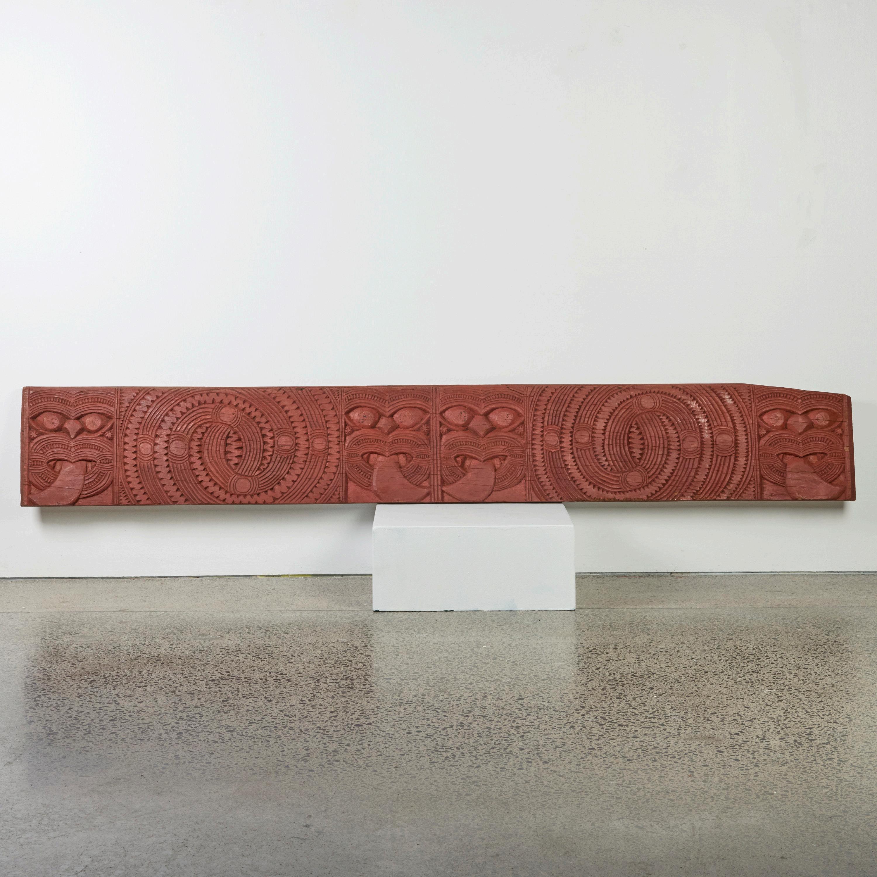 This paepae or whakairo panel is a masterful work attributed to Tene Waitere, one of the most celebrated Māori tohunga whakairo (carvers) of the late 19th and early 20th centuries. Associated with the renowned Ngāti Tarāwhai carving school of the Te Arawa confederation, Waitere’s works are held in major collections in New Zealand and internationally. The panel is intricately carved with wheku heads characterized by deep-set eyes and grimacing mouths. The surrounding field is adorned with concentric spiral motifs, echoing the patau form that symbolizes growth, regeneration, and continuity. Fine pakati dogtooth notching details run along the ridges and contours, showcasing the precision and discipline typical of Waitere’s hand. H400 W2600mm Y22407*