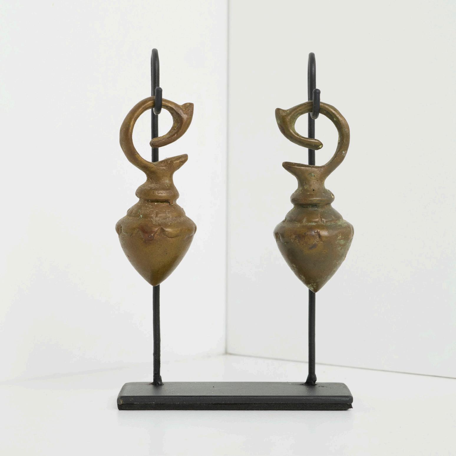 A pair of traditional Dayak brass ear ornaments, cast in solid form and shaped in reference to the areca nut which is a culturally significant motif in Borneo and much of Southeast Asia. The earrings are smooth and undecorated aside from their symbolic shape, designed for use in stretched earlobes. Their substantial weight reflects their dual role as adornment and tool for body modification. Among the Dayak, stretched earlobes and the wearing of heavy brass ornaments serve as signs of maturity, endurance, and status. Jewellery bearing symbolic forms like the areca nut connects the physical body to broader cultural narratives and traditional values. Brass is also regarded as a spiritually protective material. Earrings L65 W25 25mm, on stand H125mm